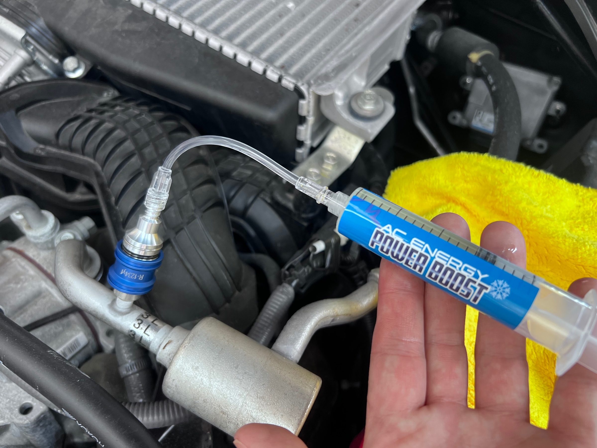R1234yf専用のアタッチメントを付けてから、
