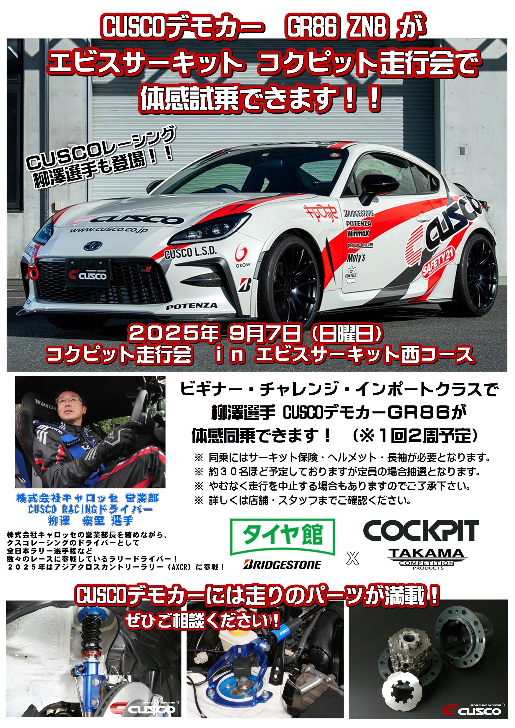 CUSCOデモカー GR86 の助手席で柳澤選手(ドライバー) の走りを体感試乗出来るチャンスです!