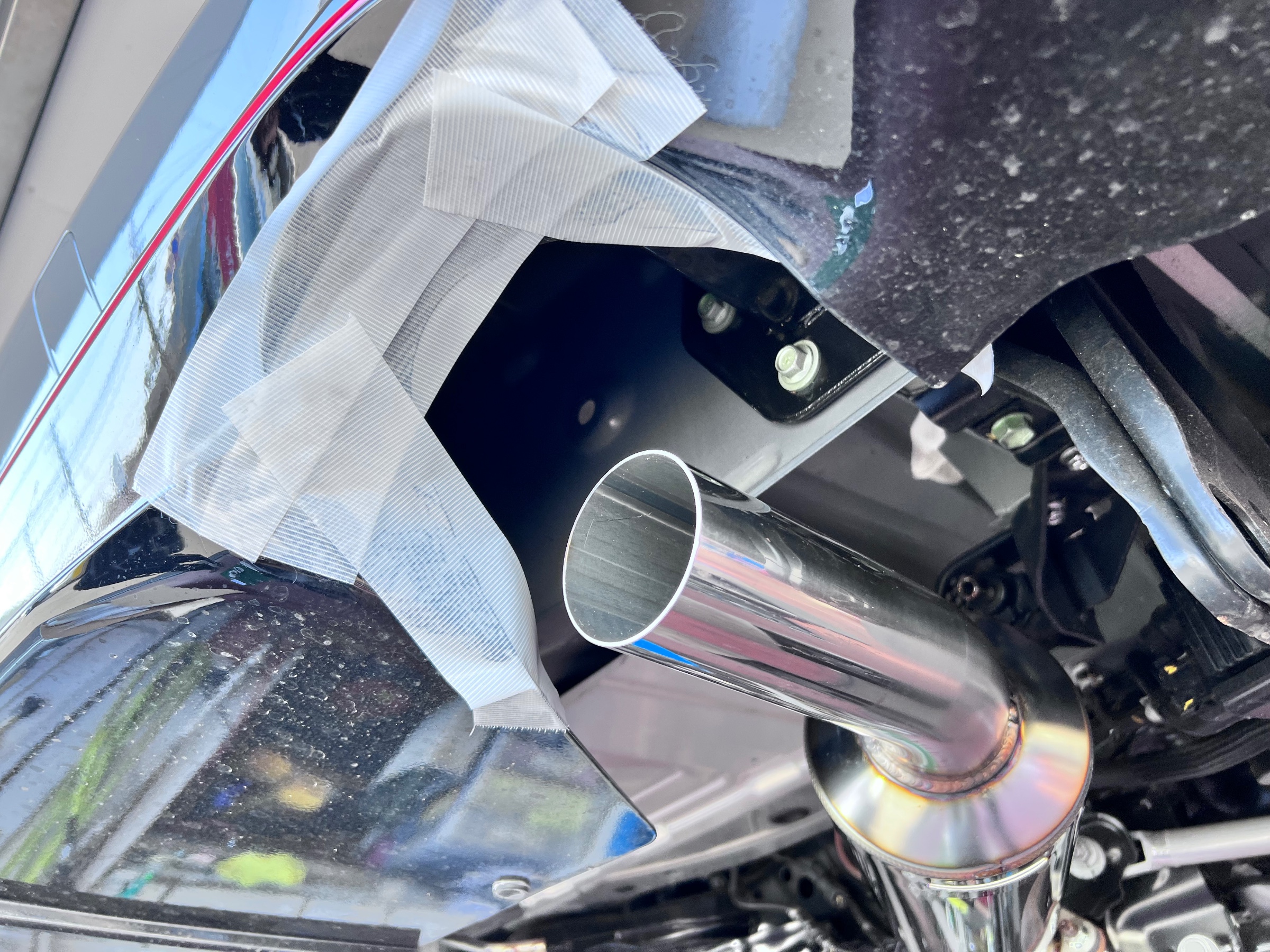 大切なお車に傷をつけないよう、バンパー周りをしっかりと養生。
