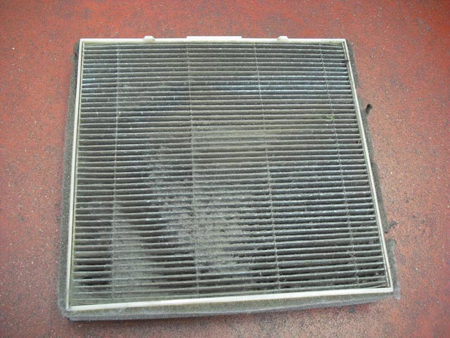 ベスト3に入ること間違い無しの、かなり汚れたエアコンフィルターの写真です。