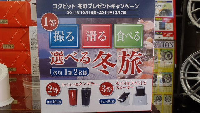 2014年10月29日 ツイート おかげさまで25周年を迎えた当店では、只今スタッドレスタイヤをはじめ日頃の感謝をこめて大セール開催中となりますので、皆さまお気軽にご来店ください。スタッドレスタイヤ & タイヤ購入のお客様へ、先着順に素敵なご成約特典グルメをプレゼント中です。 旅行が当たるくじ引きも実施中です!! Prev Next
