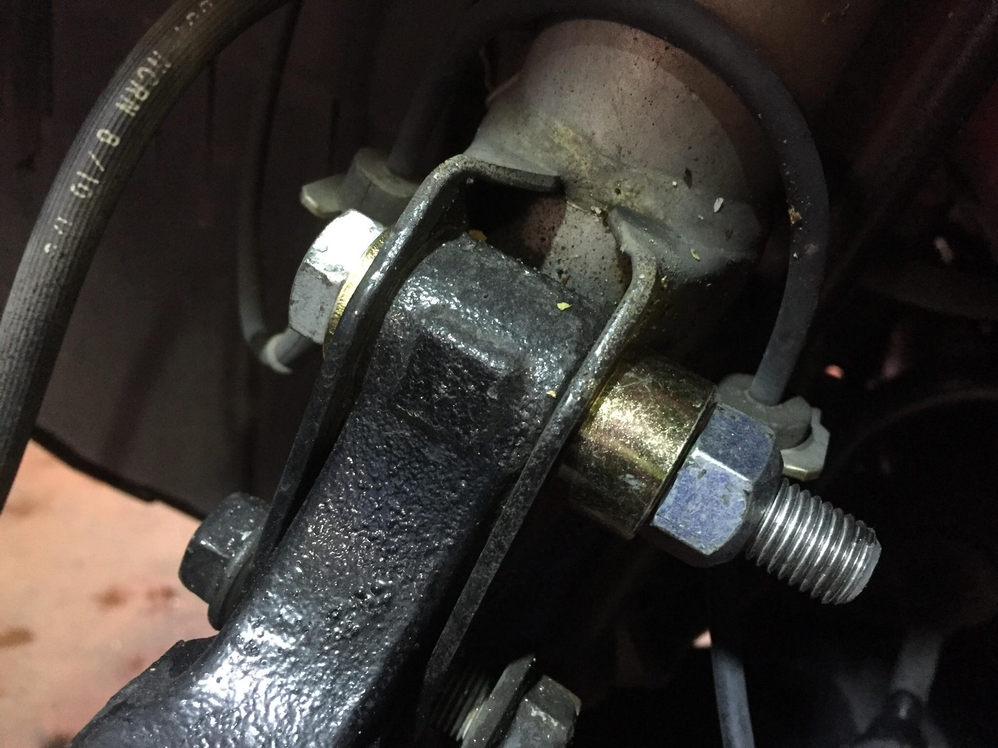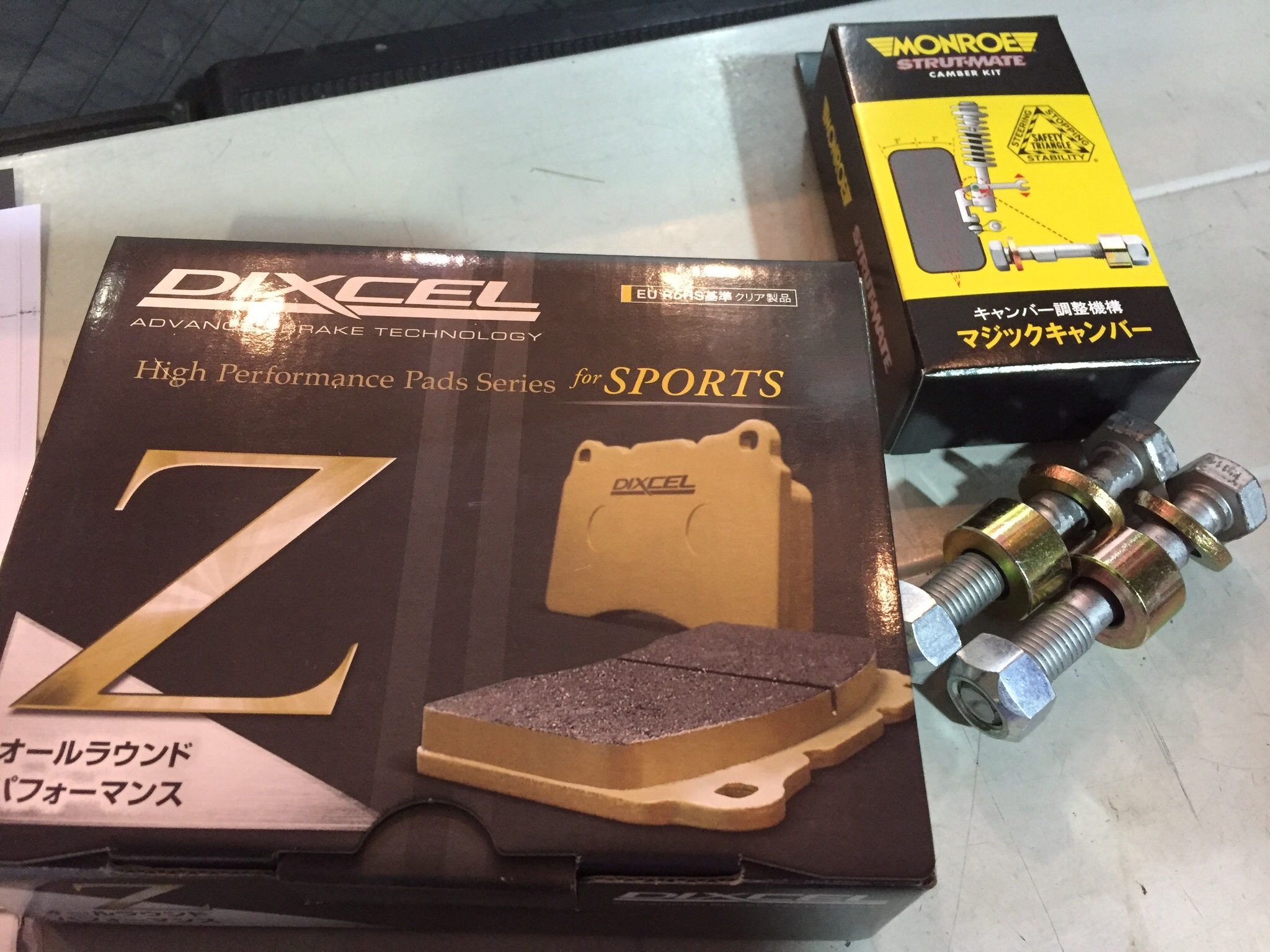 この様に 足回り(ストラットサスペンション車に限りますが)のボルトを偏心ボルトに交換すると、調整が出来る様になります。