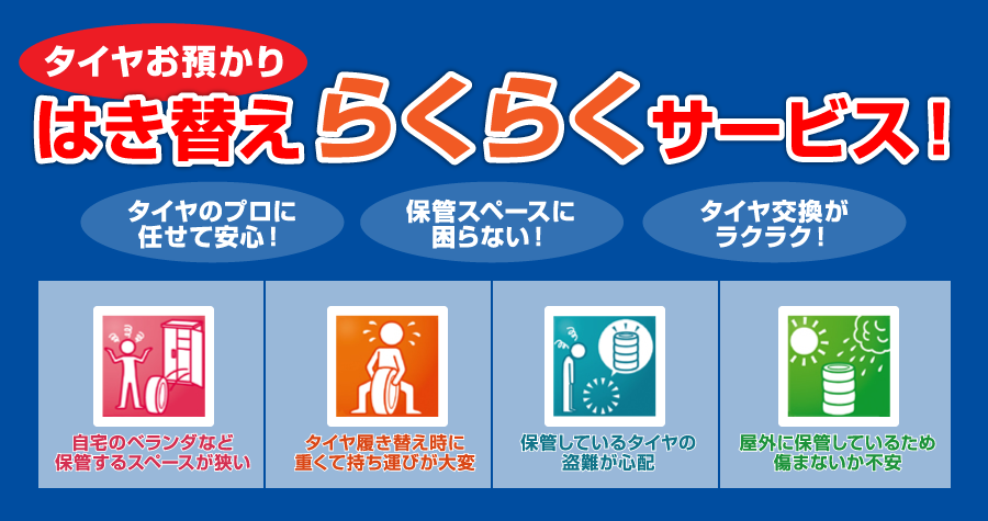 専用倉庫で安心お預かり。タイヤも長持ち。タイヤはき替えのトラブル悩みも一発解消。プロに任せて安心ラクラクとっても便利なサービスです。
