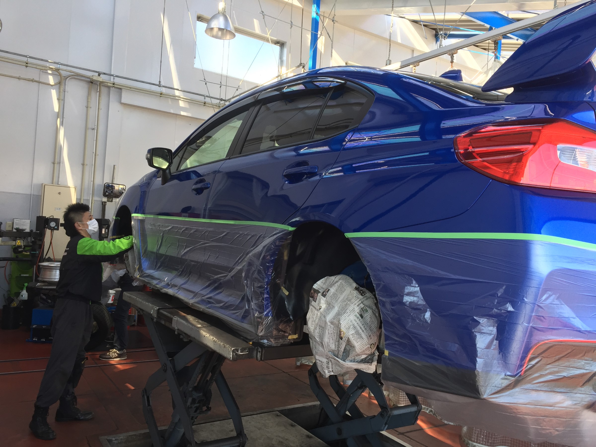 社外パーツが真っ黒くならない様に養生してから作業です!!マフラーは当店の透明で