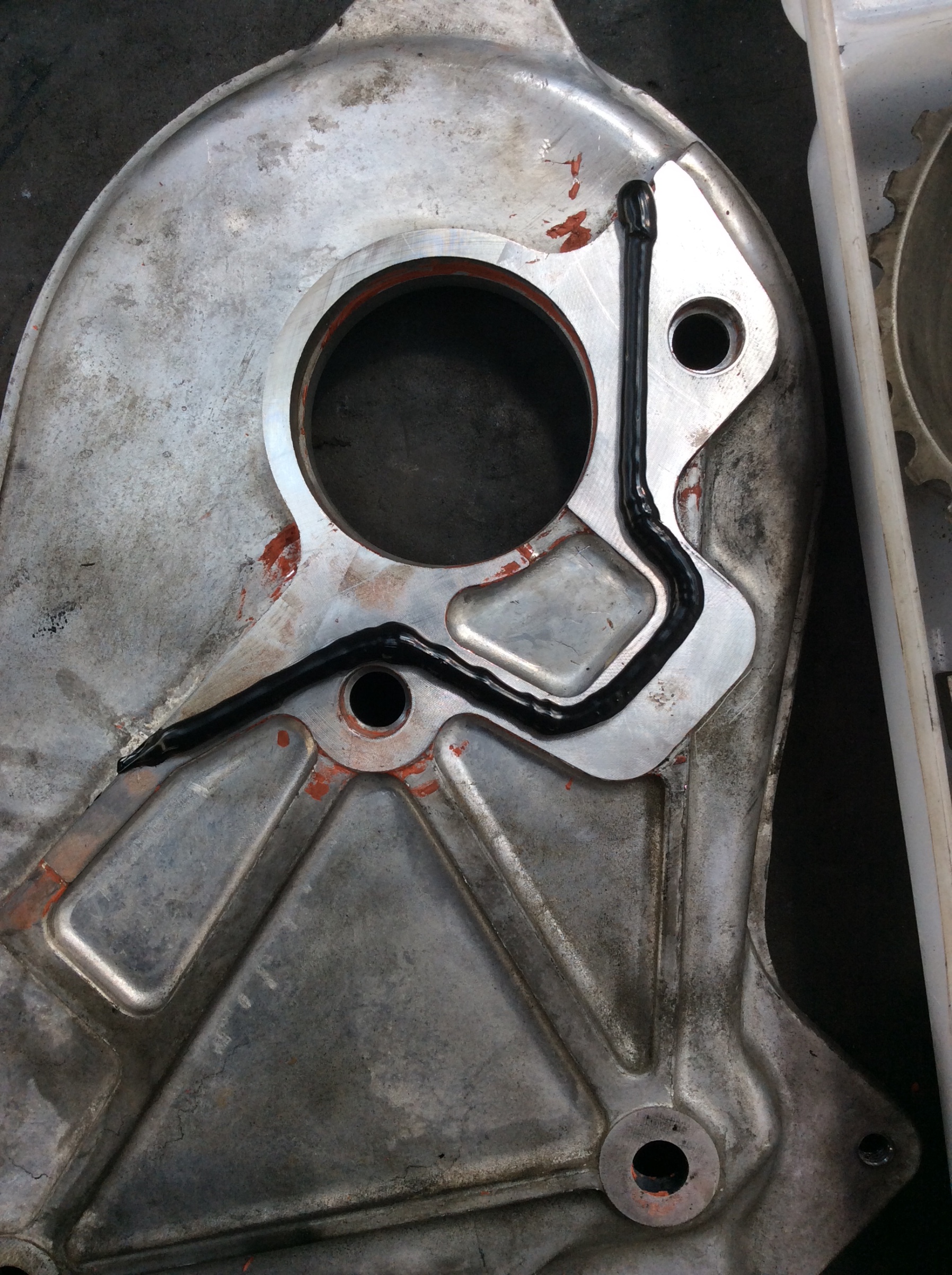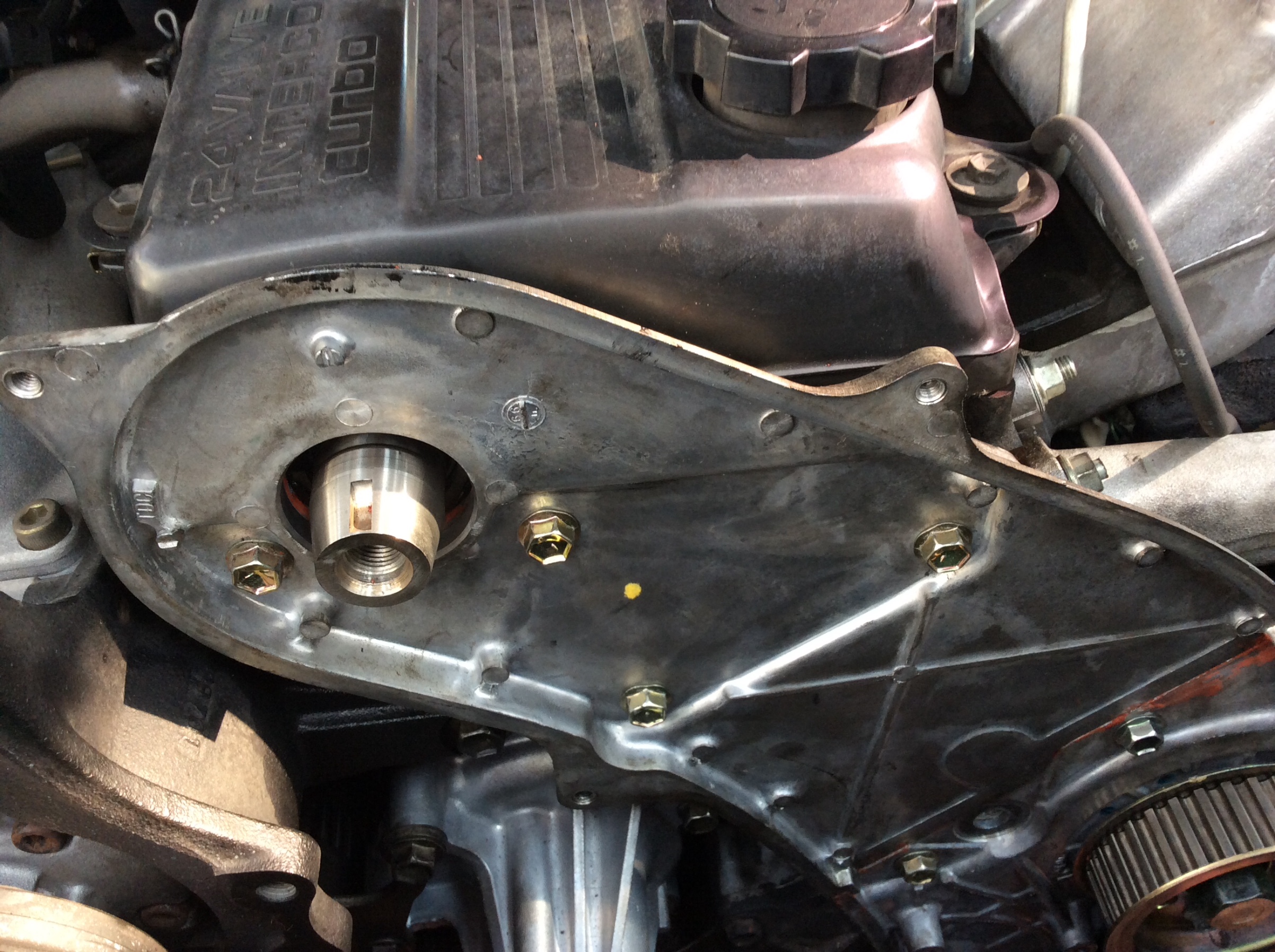 カムシャフトプーリーを外して、このアルミプレートを剥がします。