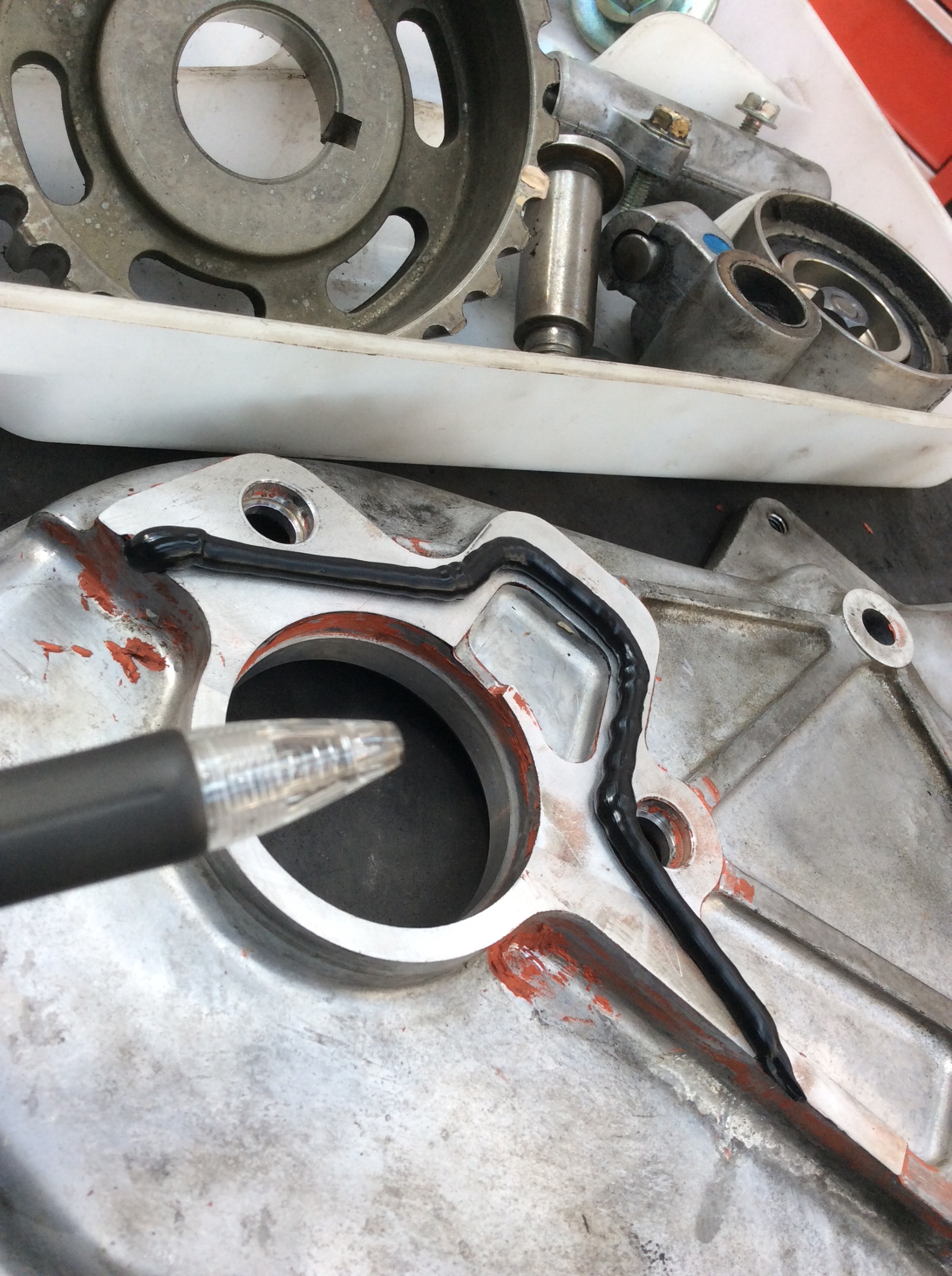 コーキングを流し込んだら、ヘッドカバーに斜めに押し当てて(押し上げて?)下の方をシリンダーに密着させて、ねじ止めです。