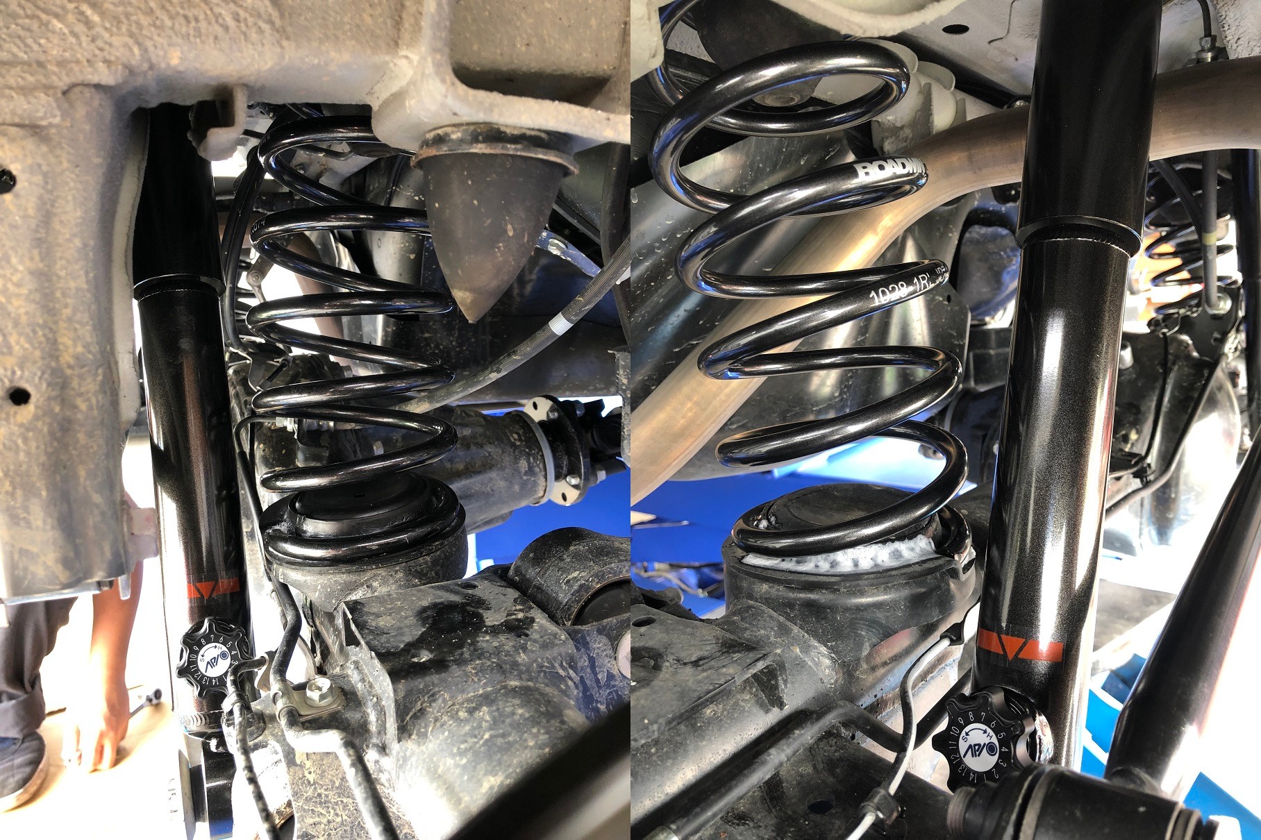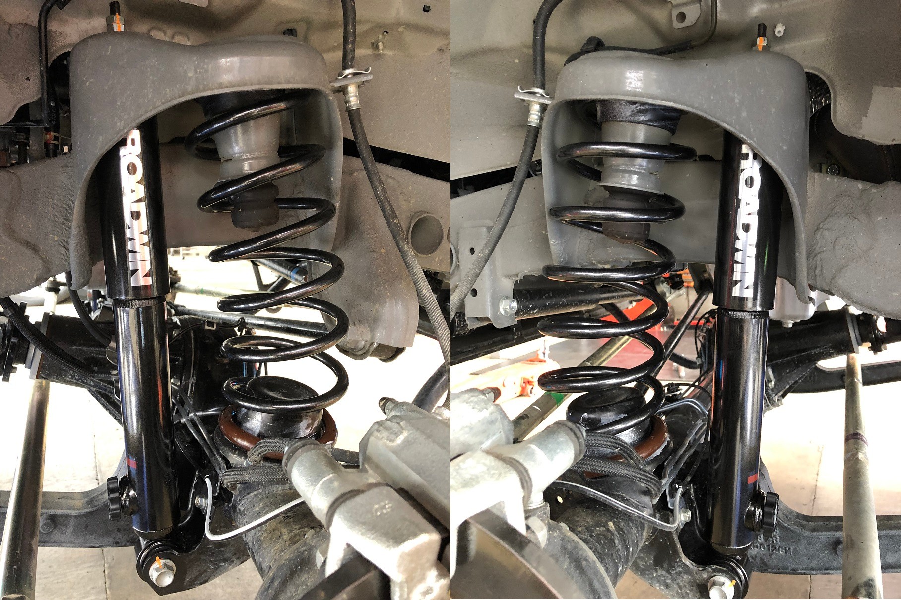 リフトアップで気をつけなくちゃいけない箇所は、ブレーキホース、ABSセンサーの配線などです。