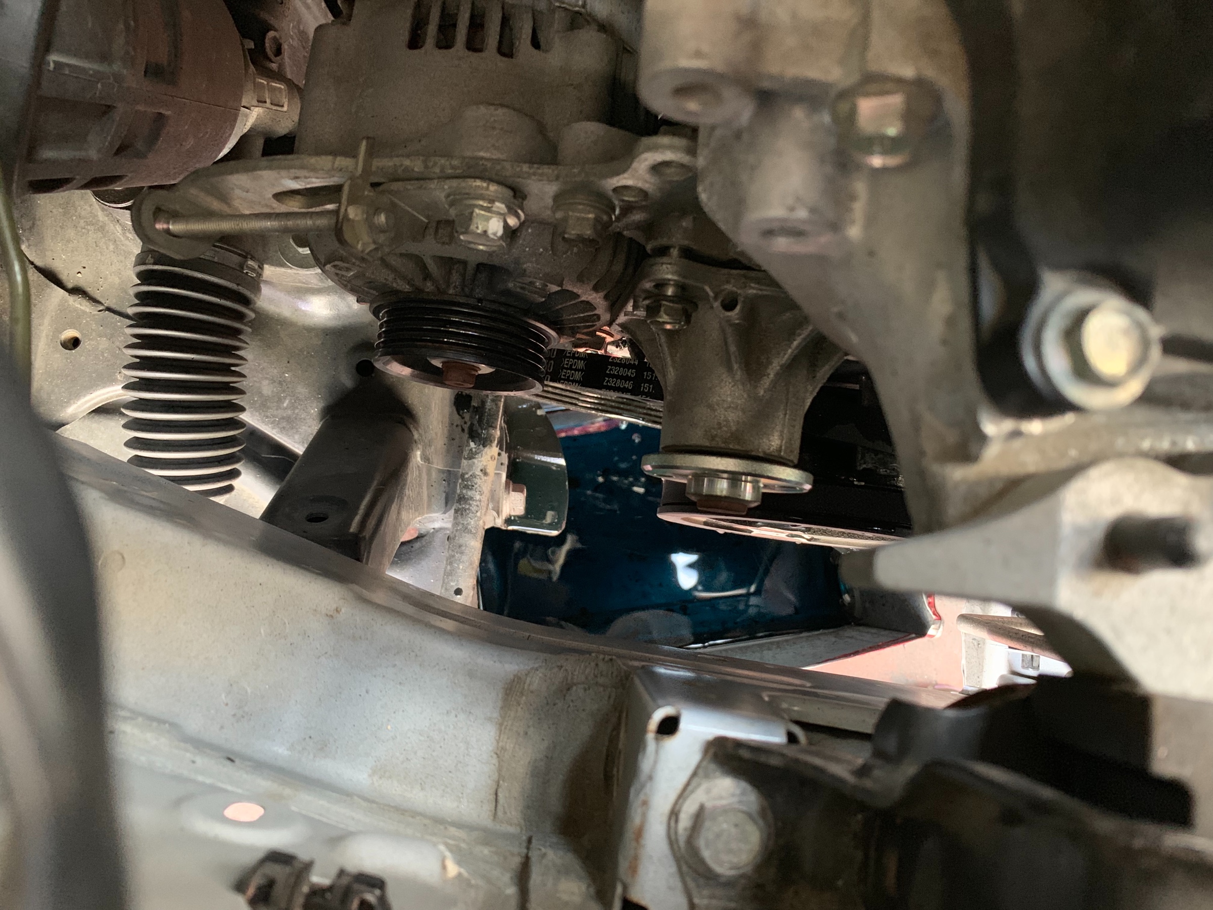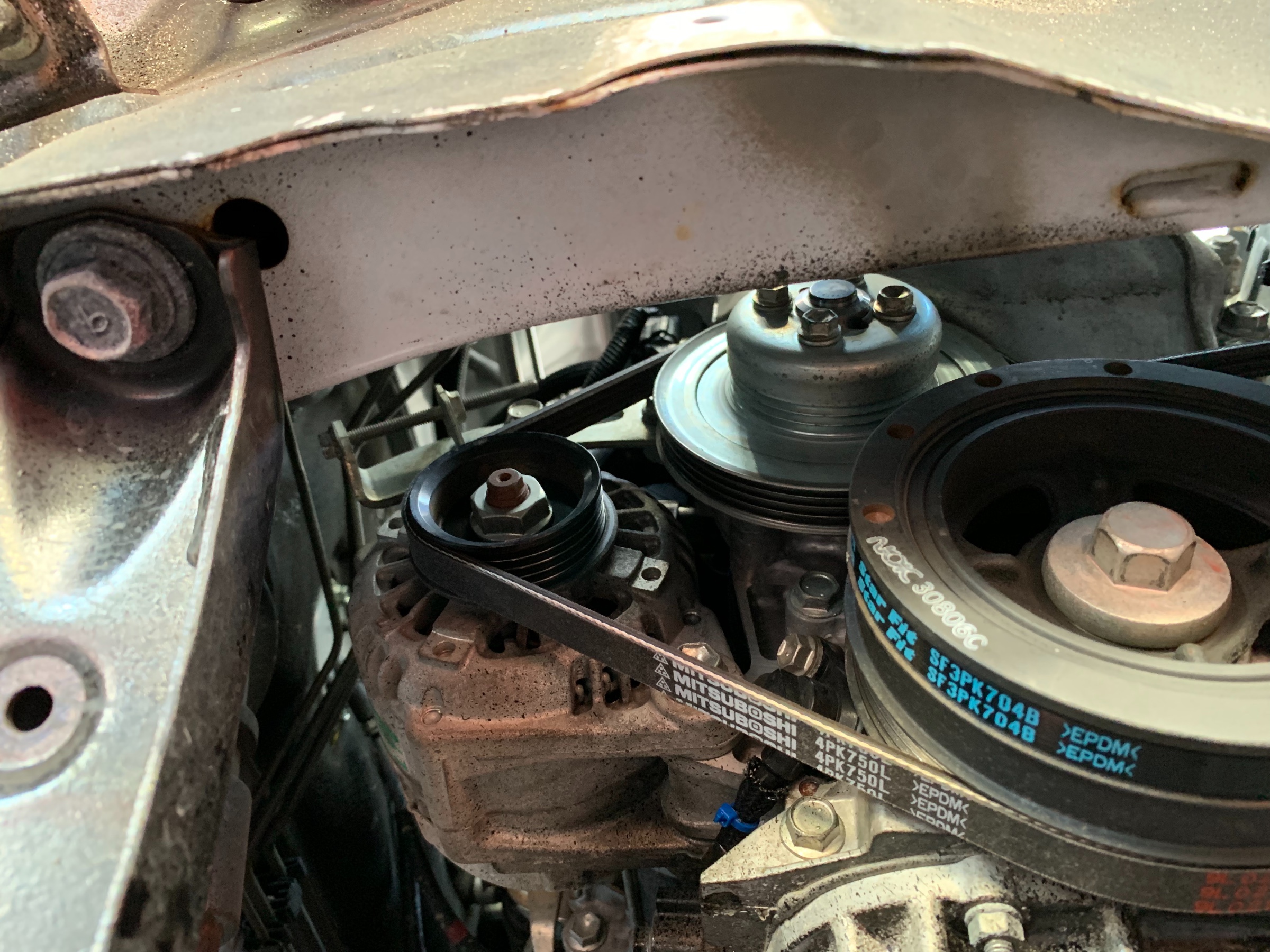 写真中央のシルバーのプーリーがウォーターポンプになります