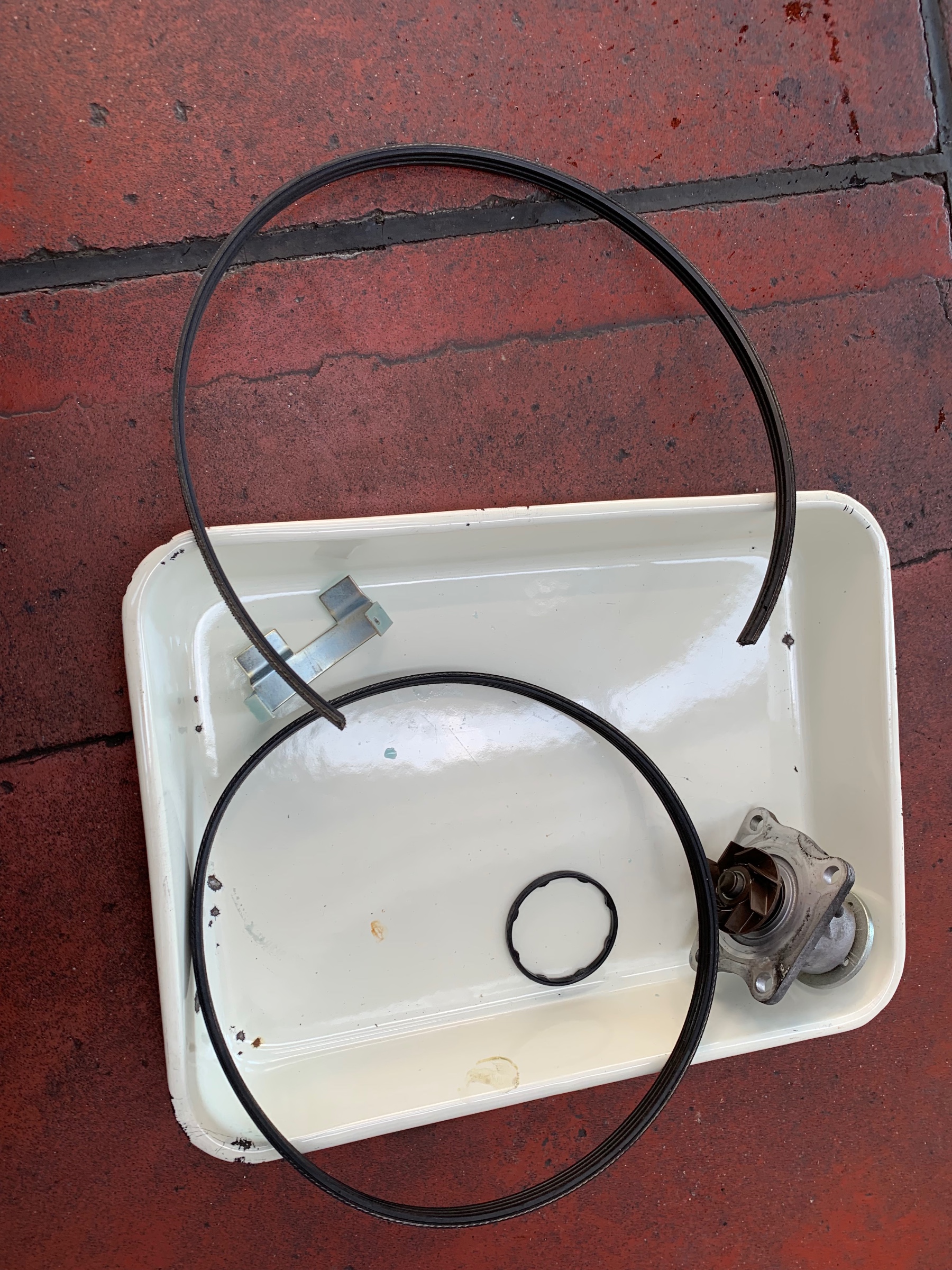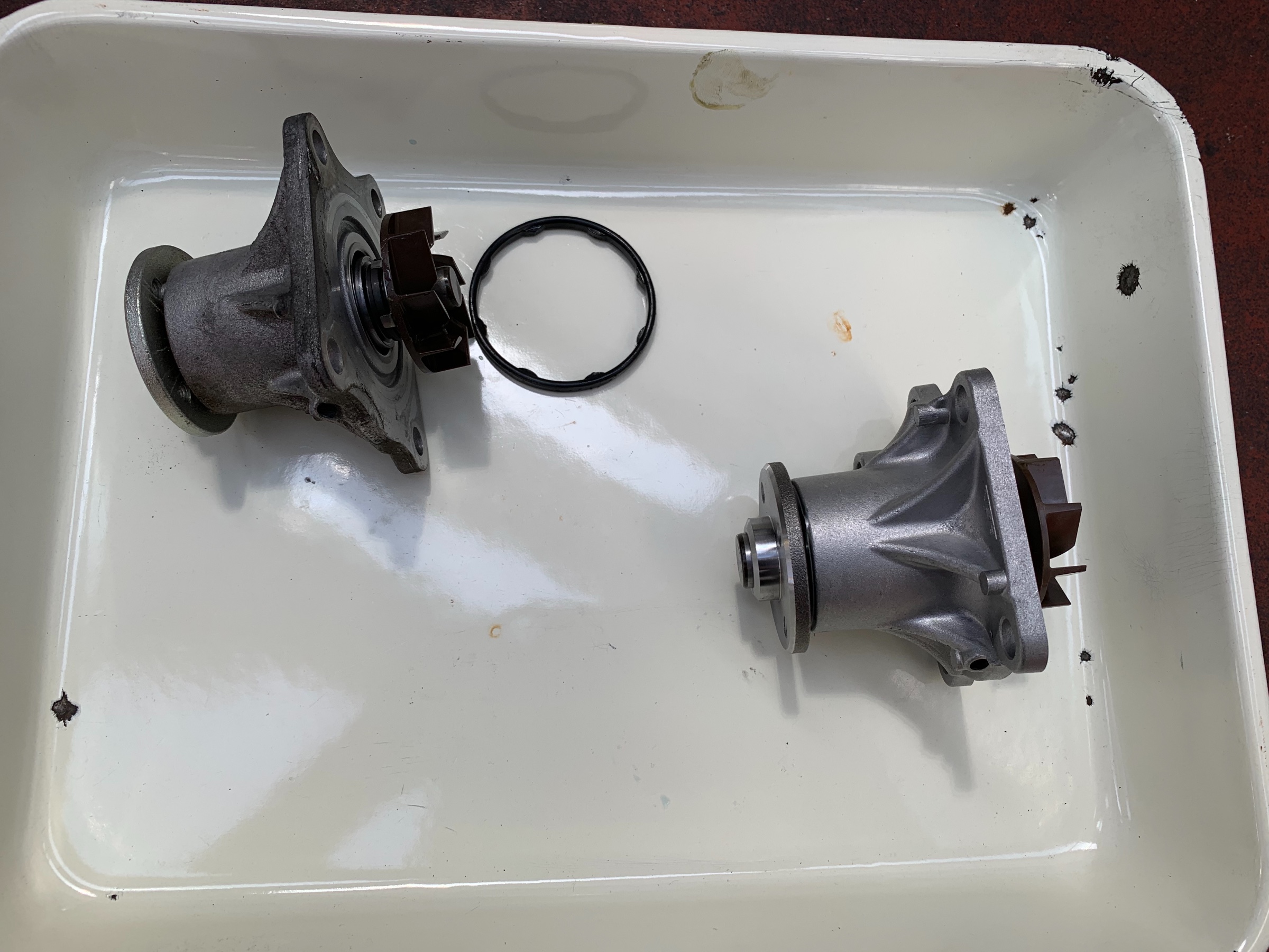点検したスタッフによると、ウォーターポンプが逝っちゃってるという事で交換することになりました。
