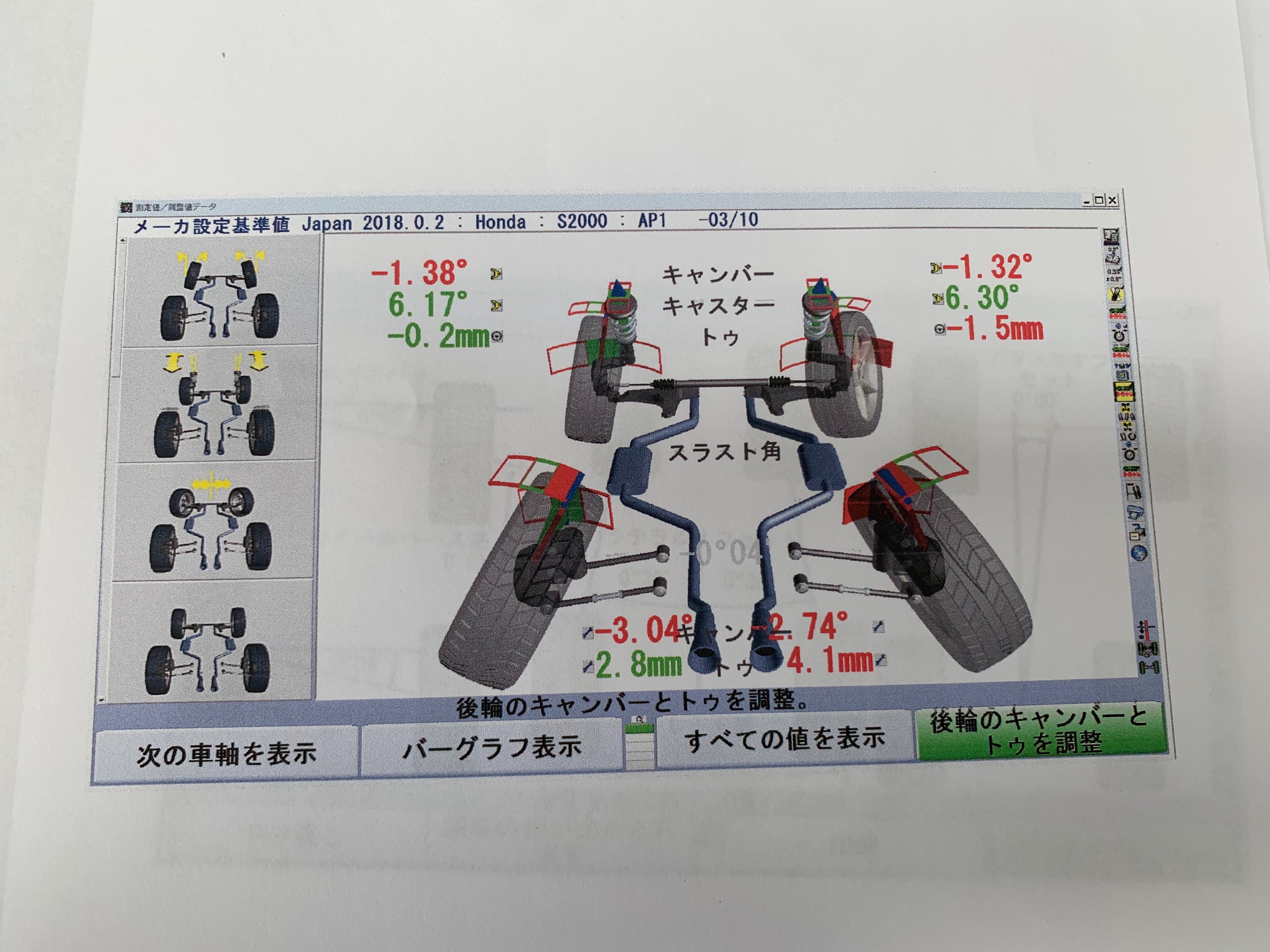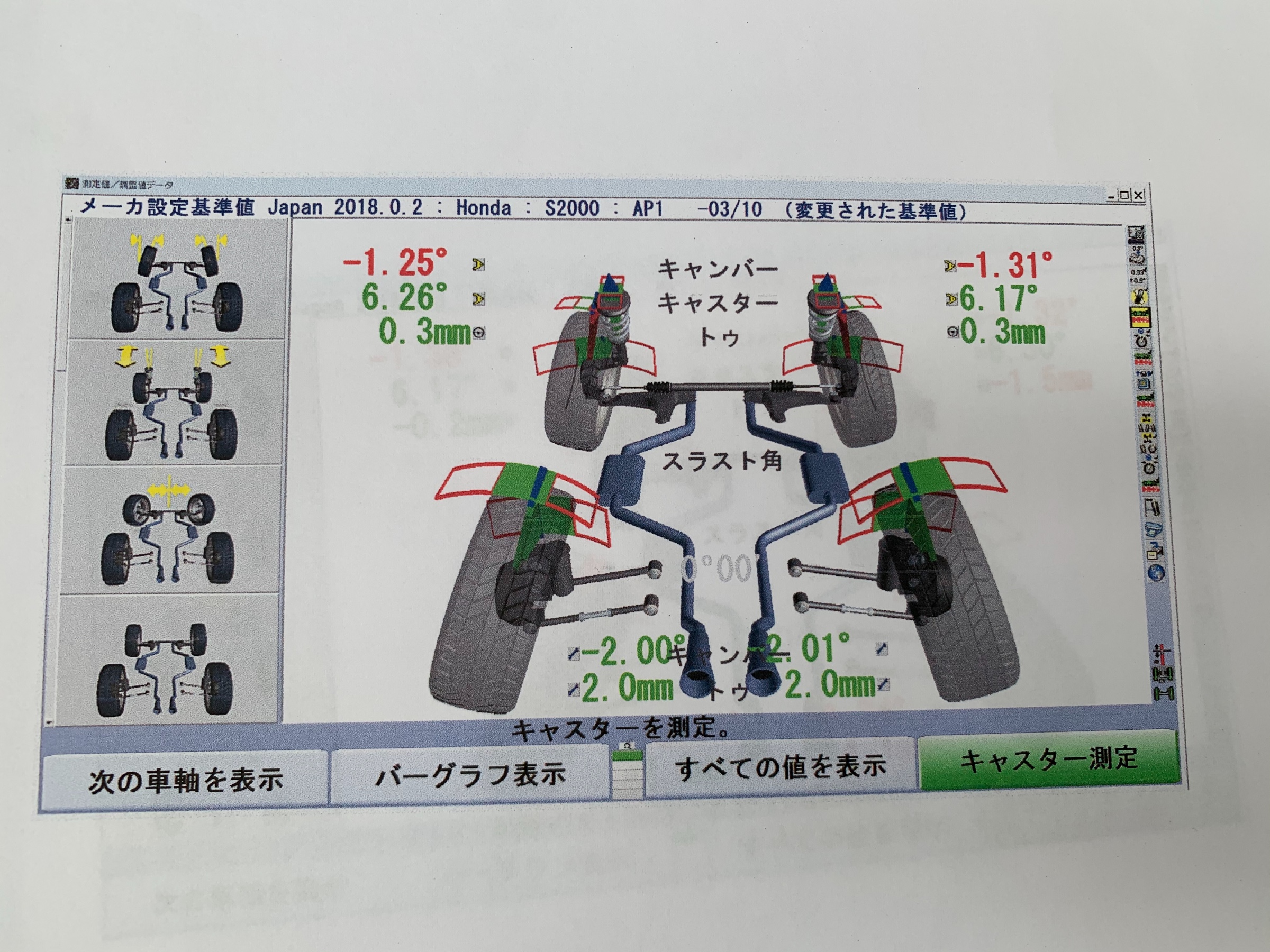 フロントキャンバーは基準値ズレてますけど、お客様のご要望でこの数値にしました。