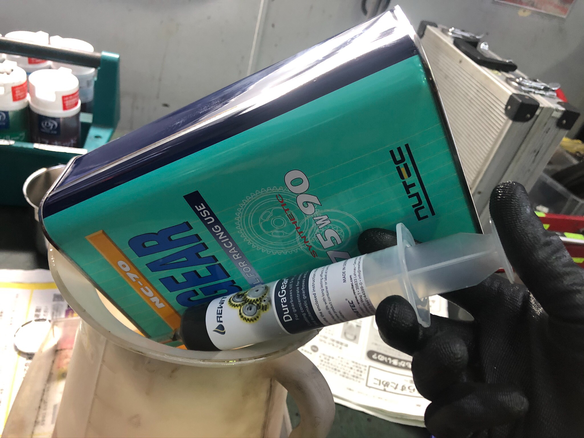 このようにミッション・ディファレンシャルギアーオイルに混ぜて注入していきます!!