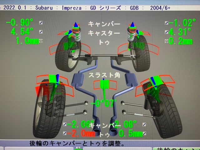調整は前後のキャンバー、トー調整に