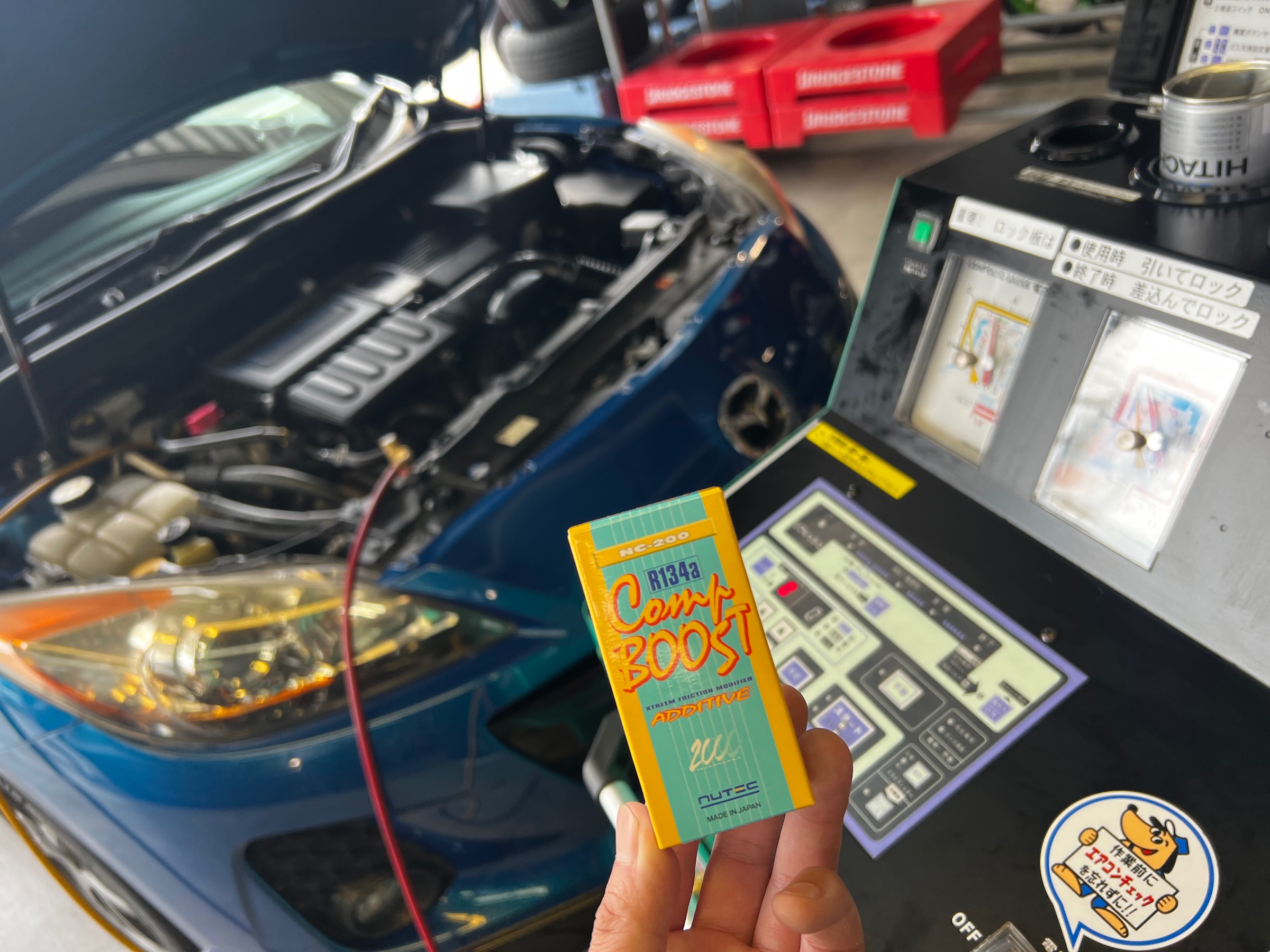 お車の劣化したエアコンガスをクリーニングマシンの中に回収 → リフレッシュしてから車に戻す。 → 車両の適切なガス量になるように調整、補充をする。 → ガスと一緒に抜けたコンプレッサーオイルを補充!(NUTEC コンプブースト NC-200がおすすめ! パワーロスを減らして燃費を落としにくくなります。)