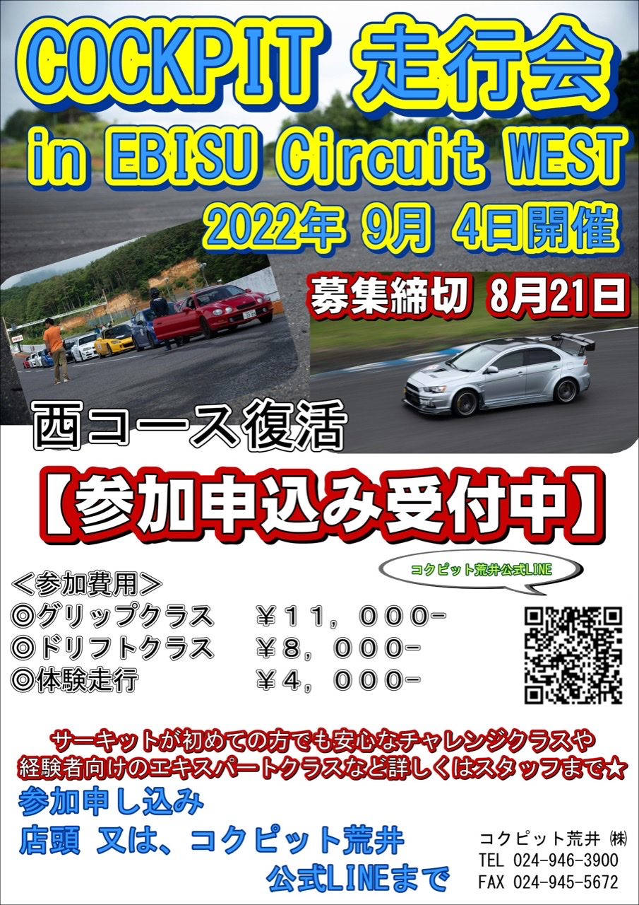 または コクピット荒井 公式LINEにて【 走行会申込みの旨をメッセージ 】を