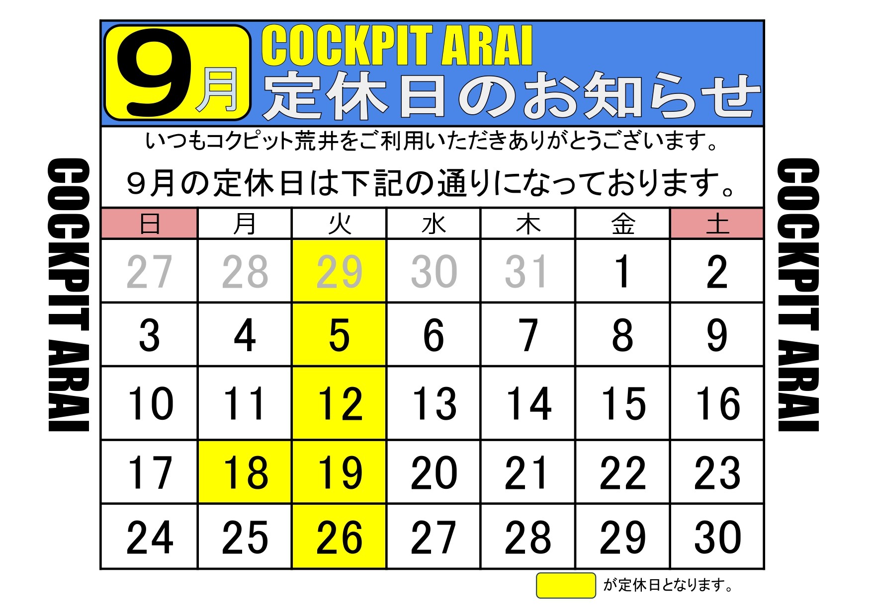 2023年8月27日 日頃より当店をご利用いただき誠にありがとうございます。 9月定休日のご案内です。 9月3日(日曜日)がエビスサーキットでイベント日となるため臨時休業となります。 また 第三月曜日 9月18日(敬老の日)が定休日となります。 カレンダーにて掲載させて頂きましたので、ご確認のほど宜しくお願い致します。 クリックで画像を拡大 Prev Next