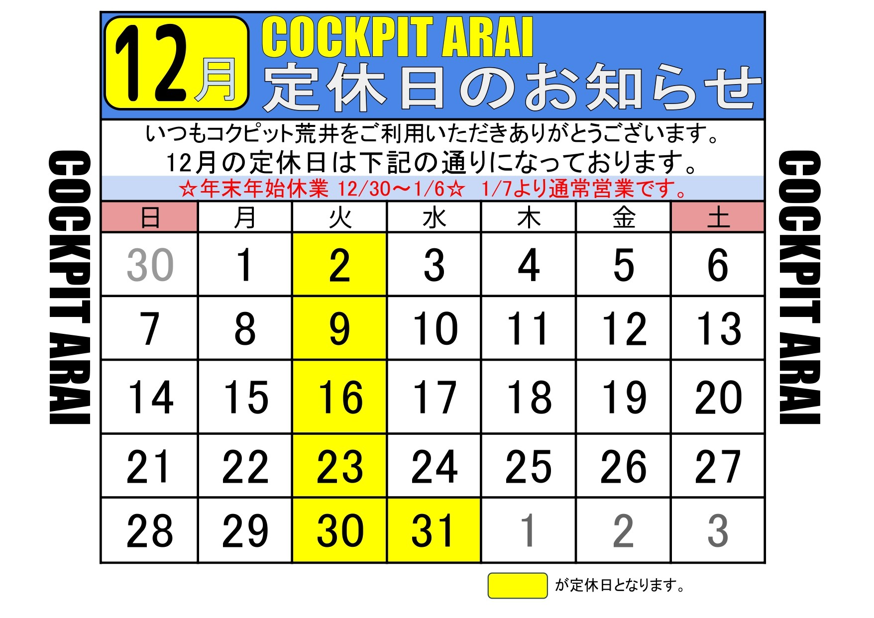 2025年12月1日 日頃より当店をご利用いただき誠にありがとうございます。 12月 店舗休業日のご案内です。 年末年始休業 12月30日~2026年1月6日 となります。 2026年1月7日より通常営業となります! カレンダーにて掲載させて頂きましたので、合わせてご確認ください。 クリックで画像を拡大 Next