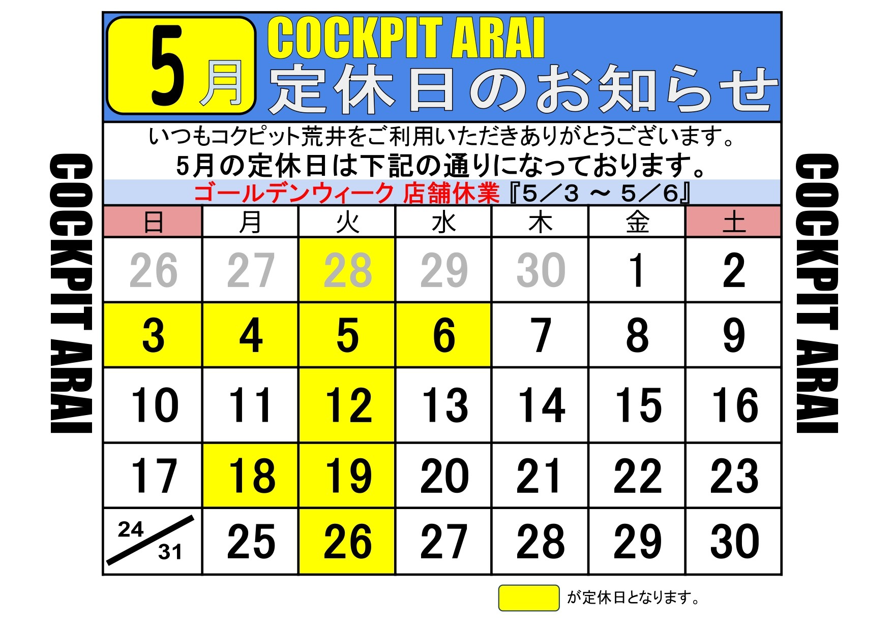2026年4月27日 日頃より当店をご利用いただき誠にありがとうございます。 5月 定休日 及び ゴールデンウィーク期間中 の休業のご案内です。 カレンダーにて掲載させて頂きましたので、ご確認のほど宜しくお願い致します。 クリックで画像を拡大 Next