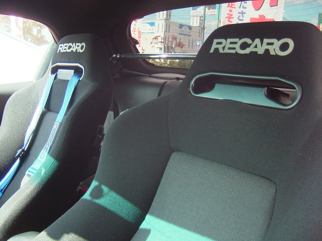 こちらはレカロSR3のシートのサイドの部分を削って、張りなおしたシートが付いております。どうしてもドアにシートの横の部分が干渉するので、横に出ている部分を削って張りなおしてあります。これならRX-7にもジャストフィットですね。。