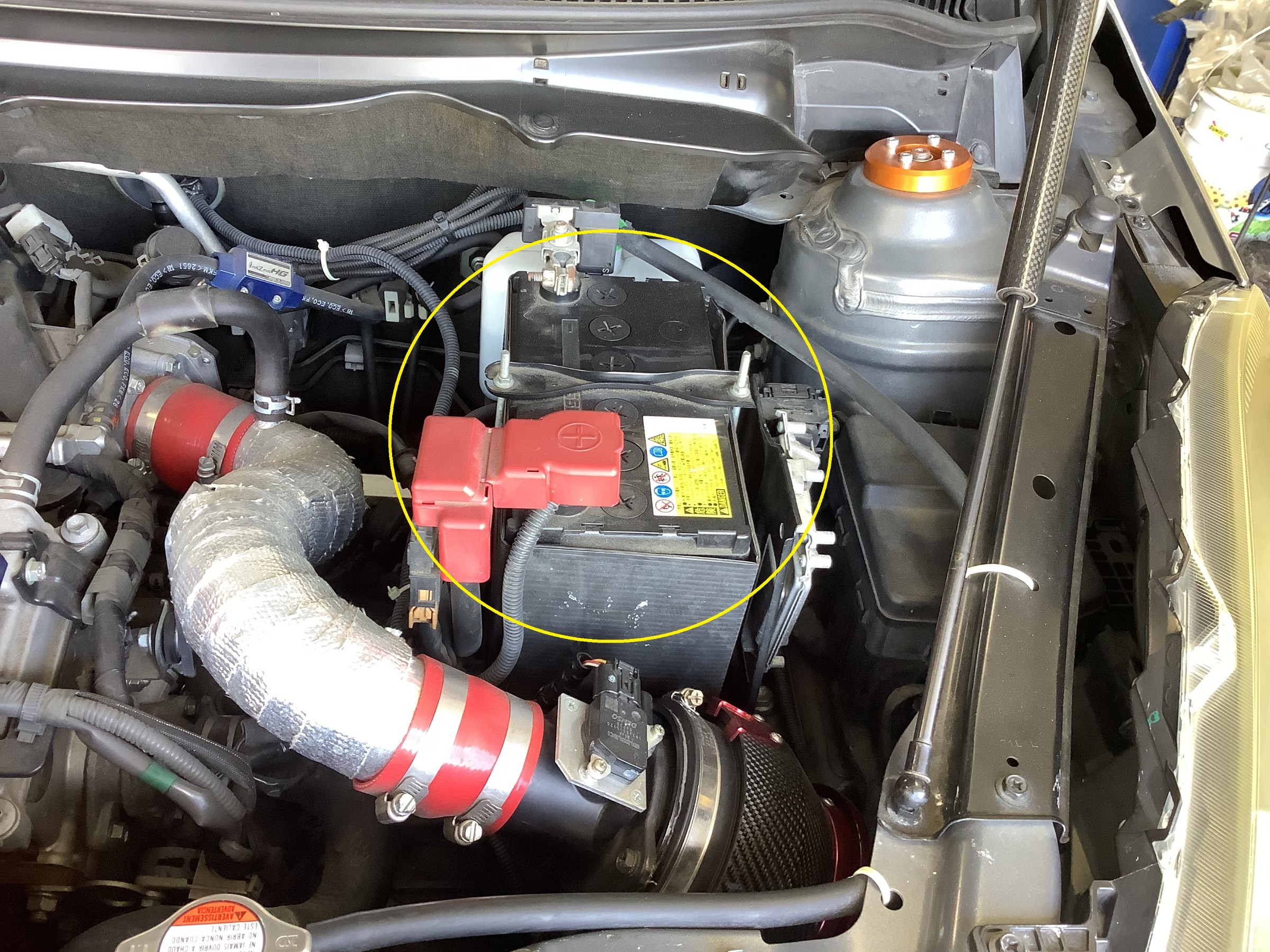 まずは 旧バッテリーを外します。(黄色〇印)
