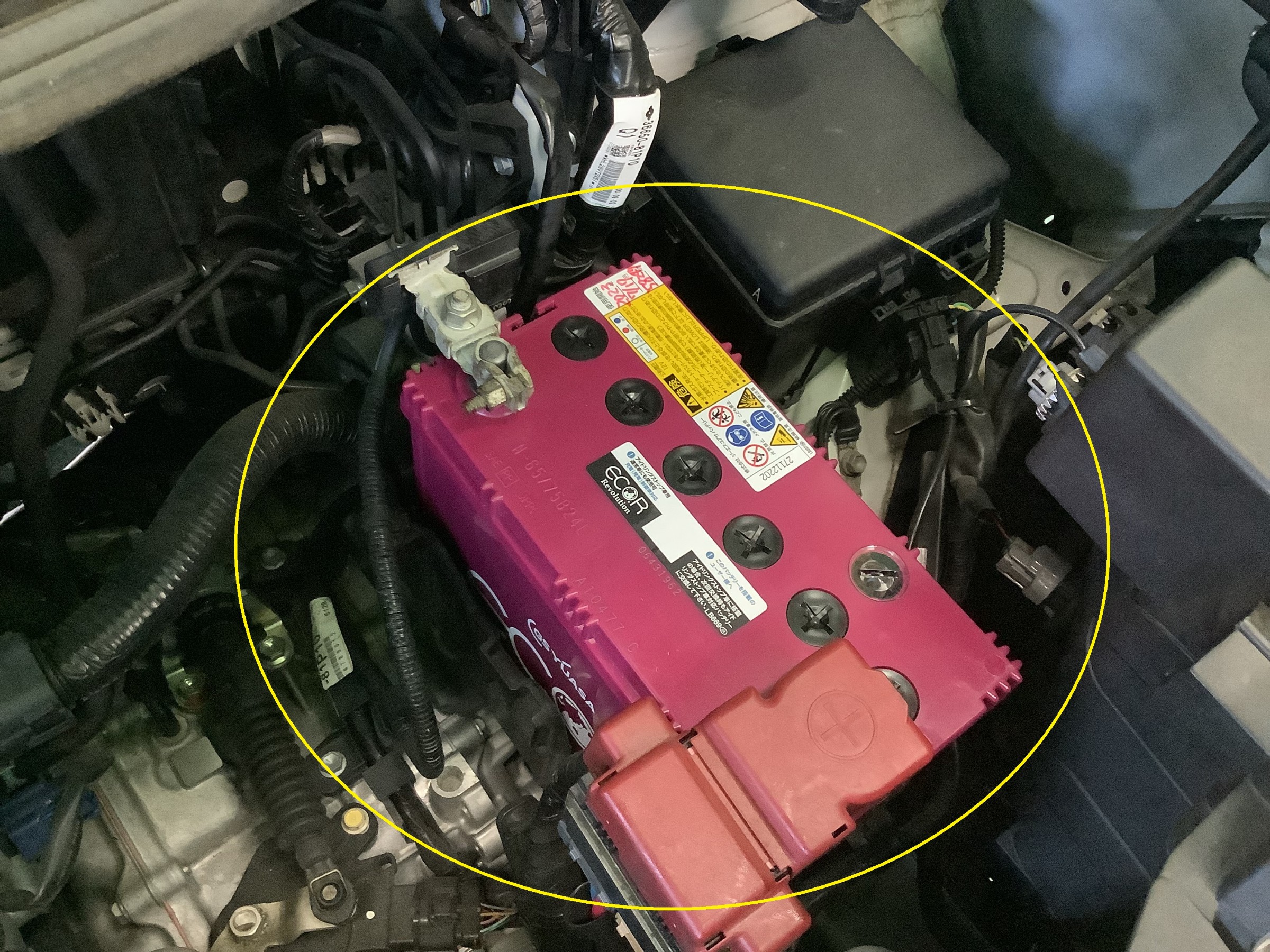 #セリアル#製造年月日#アイドリングストップ車用#年数経過#ワインレッドボディー#エンジンルーム