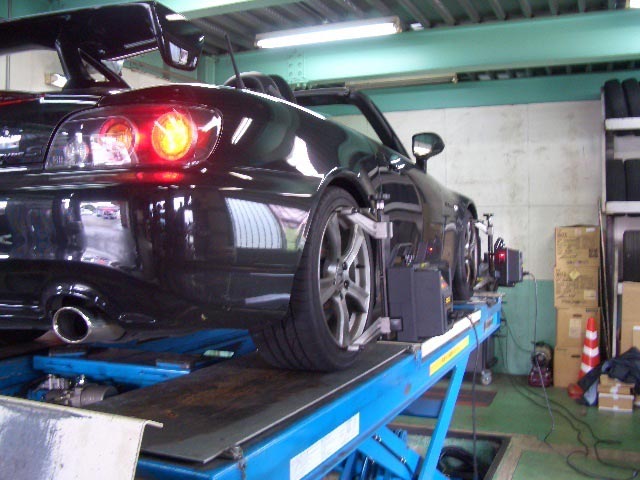 本日の患者さんは、R32 GT-Rと少し前に車高調を装着したS2000です。S2000に関しては、足の慣らしが終わってから車高を決めてアライメントと言う流れになっていました!! 取り付け作業時に吊るしで装着して、車高が落ち着いた頃にアライメント…てな感じです!!