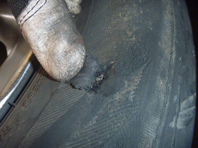 フロントタイヤの外側が、キラリと光るワイヤーが露出してしまっています!!!
