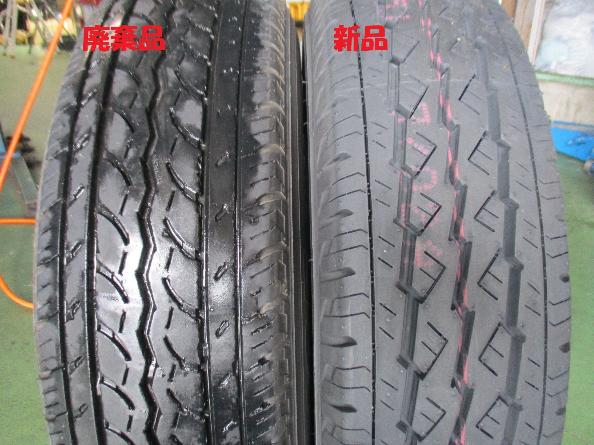 外した廃棄タイヤ=左 取り付ける新品タイヤ=右