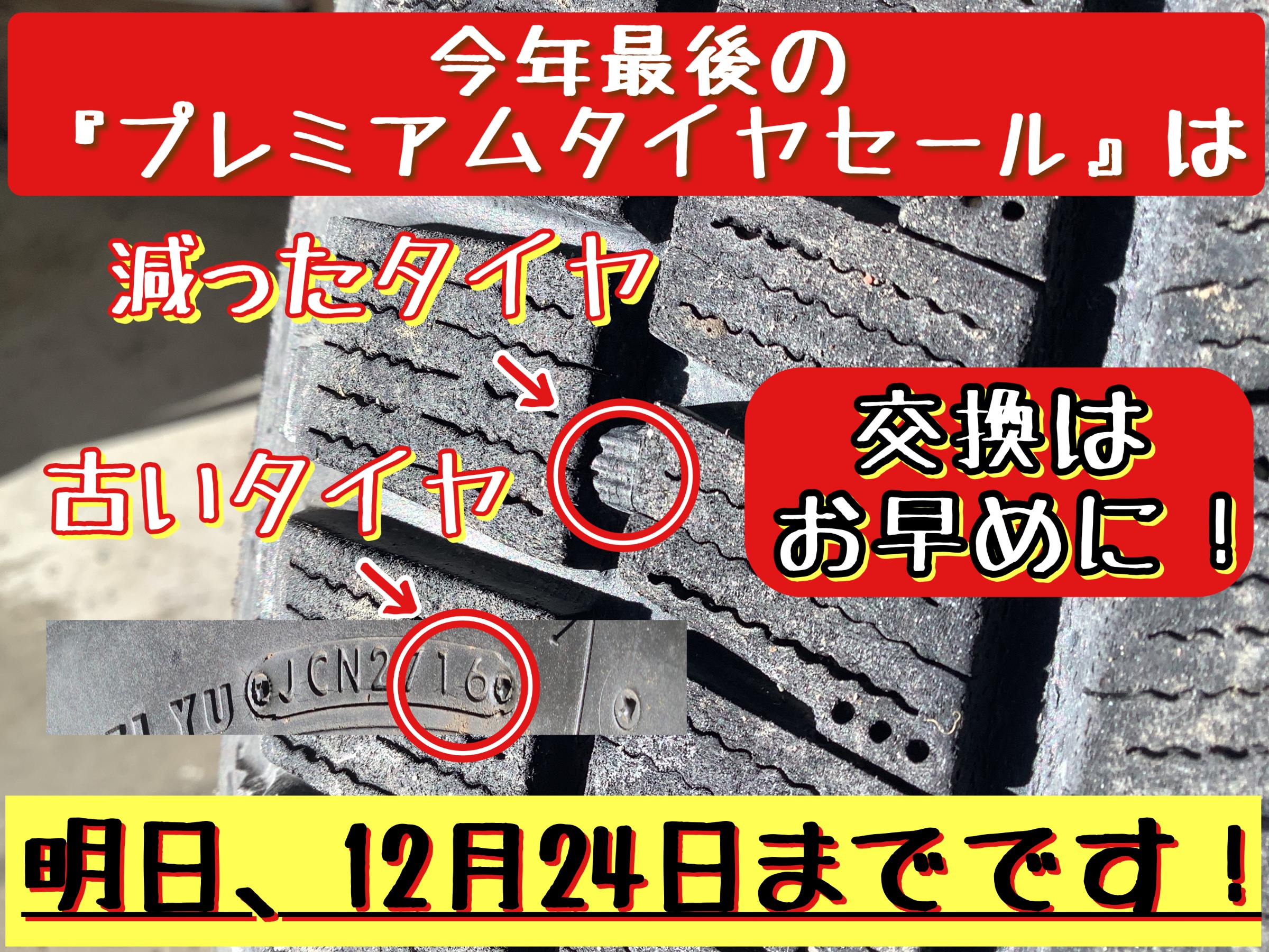 2023年12月23日 ツイート こんにちは! 『スタイルコクピットフィール』です! 好評開催中の 今年最後の『プレミアムタイヤセール』は 明日、12月24日、日曜日までです! 減ったタイヤや古いタイヤをお使いの方、 年末年始のお休み前に準備はお早めに! 皆様のご来店、お待ちしてマース! Prev Next