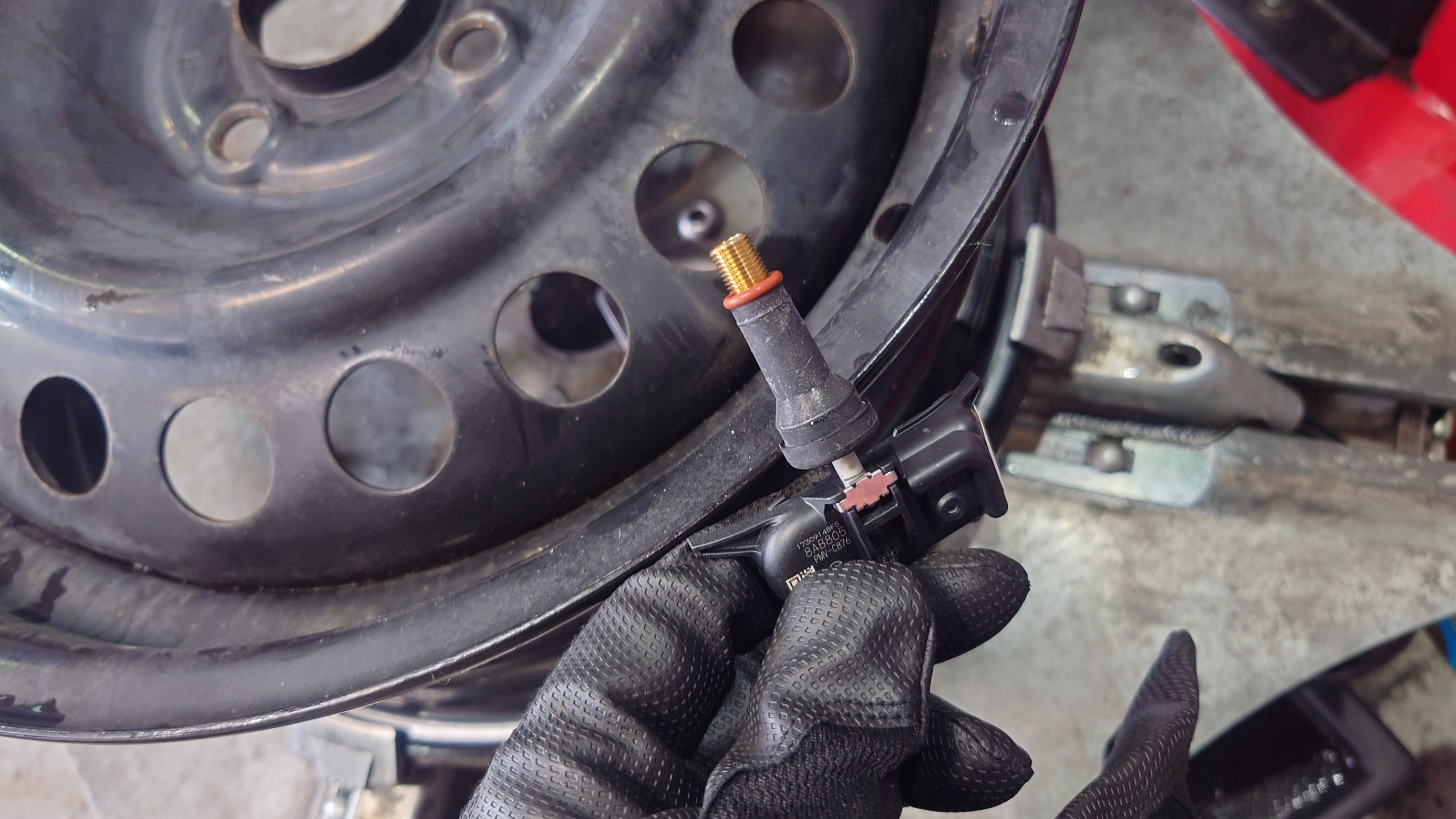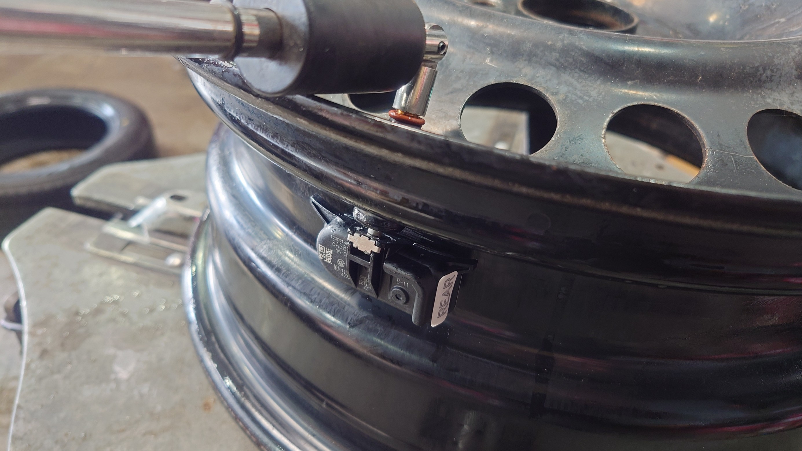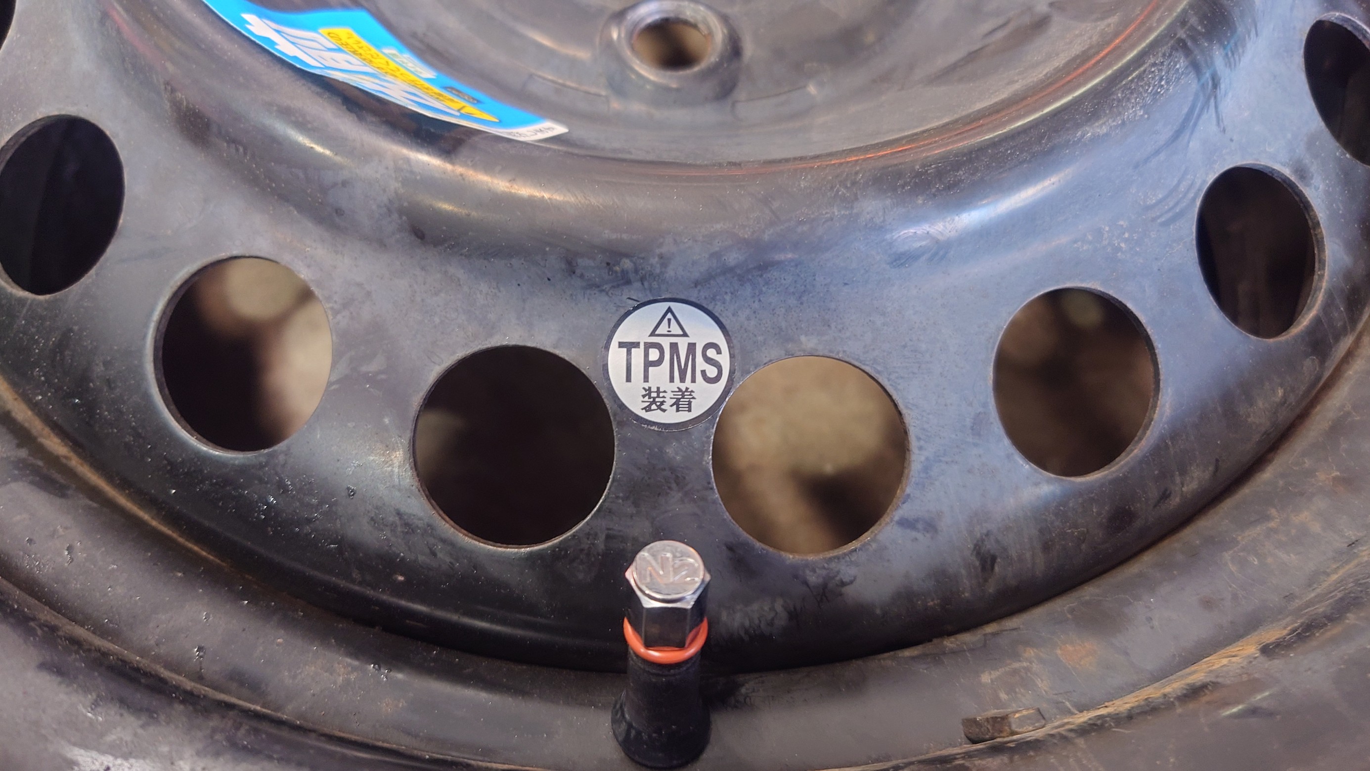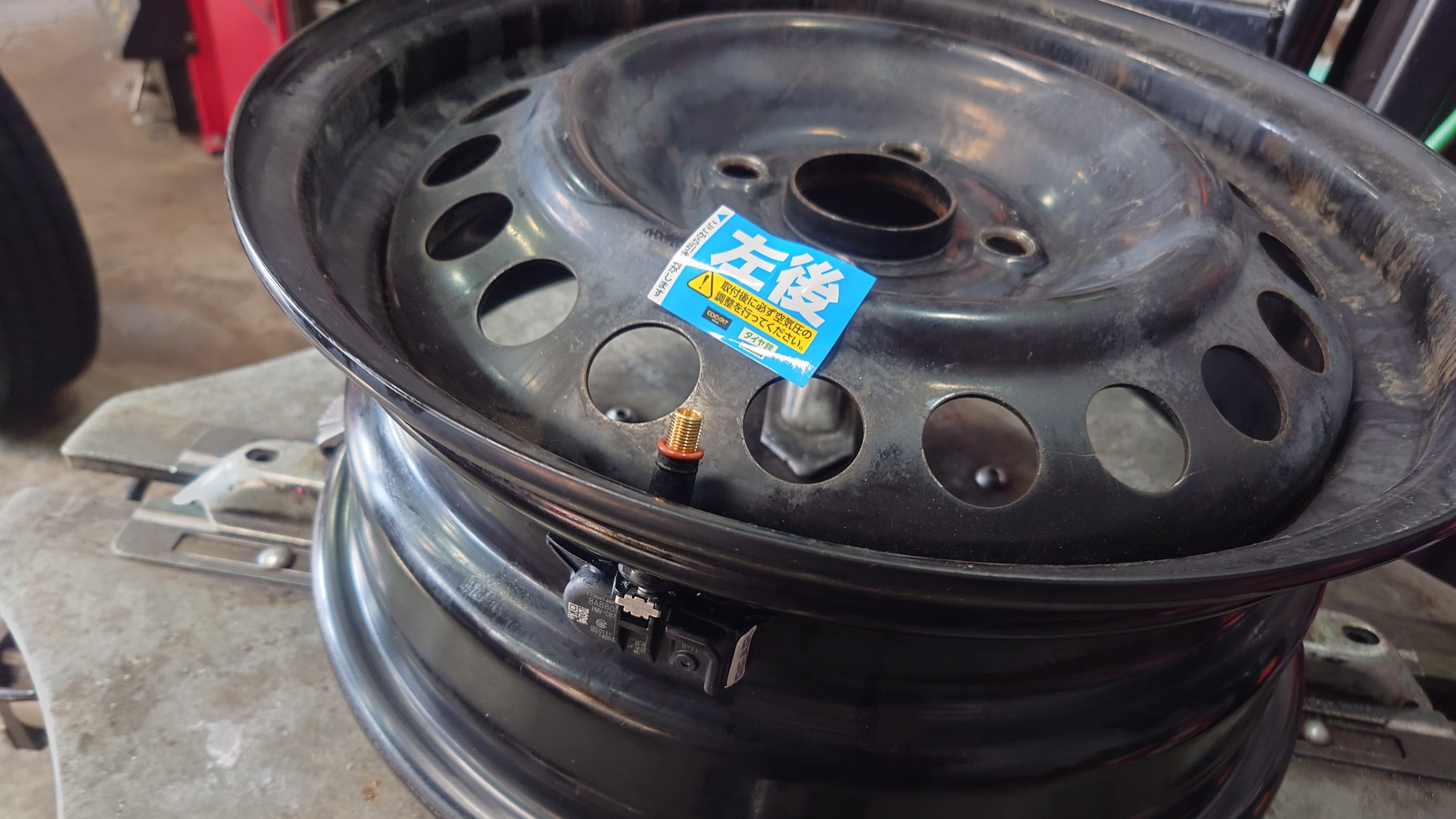 センサー送信機を取付したホイールに