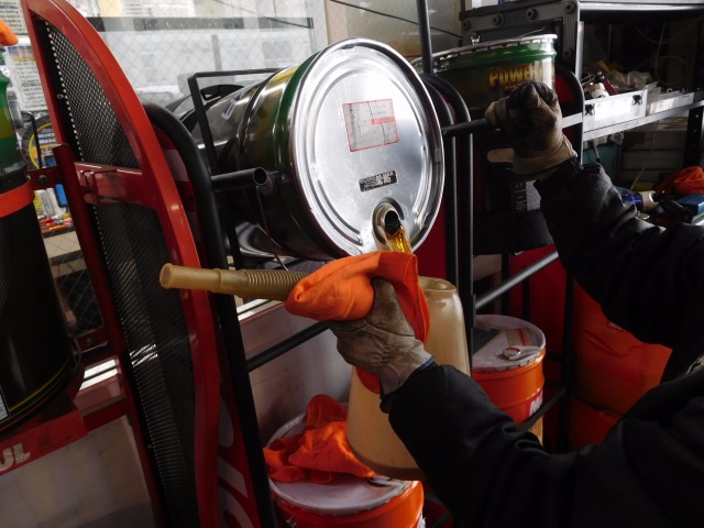 大きなアンダーカバーを外して ドレンからオイルを抜いてます。