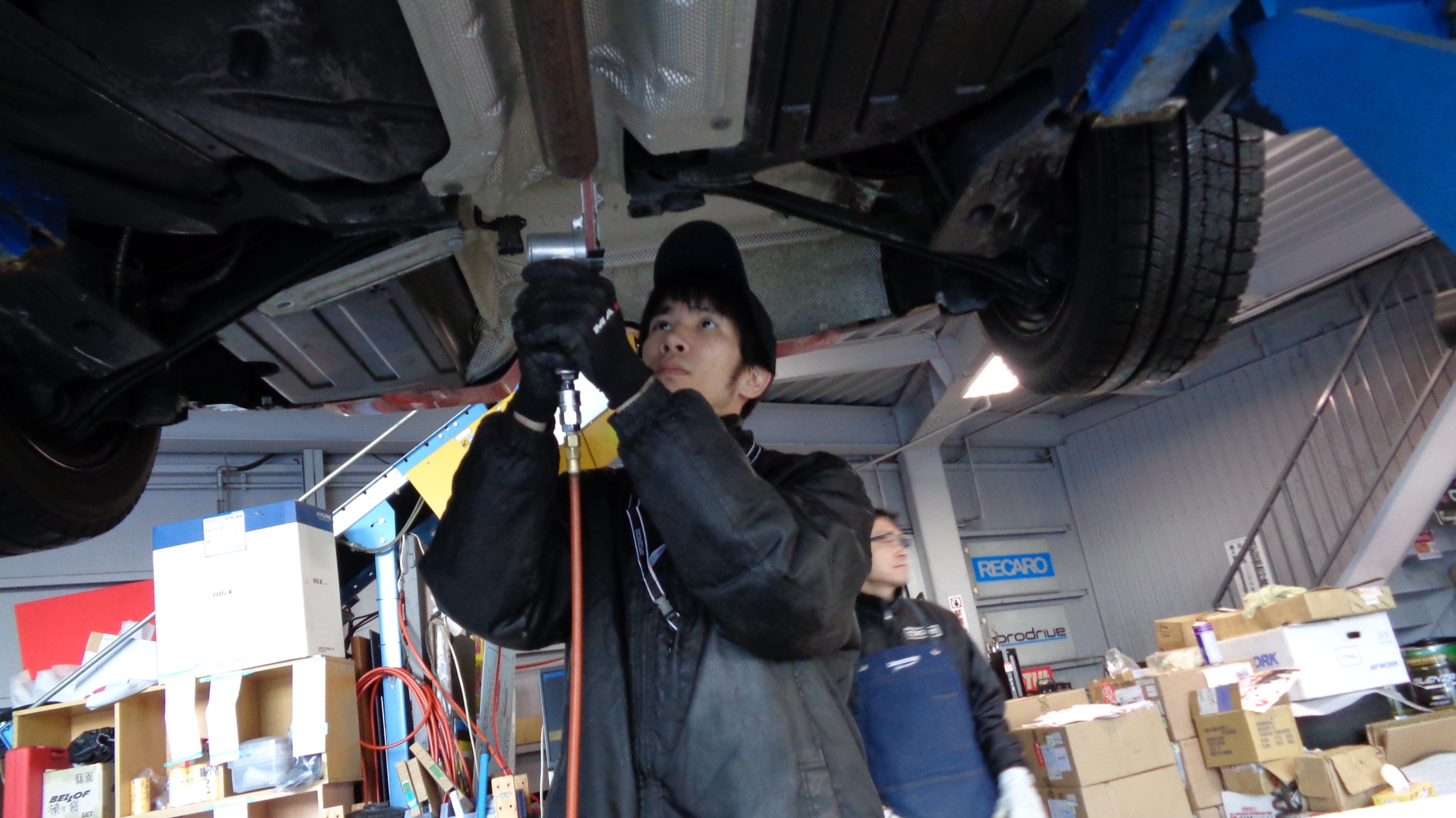 まず純正マフラーの取外しから始めます。