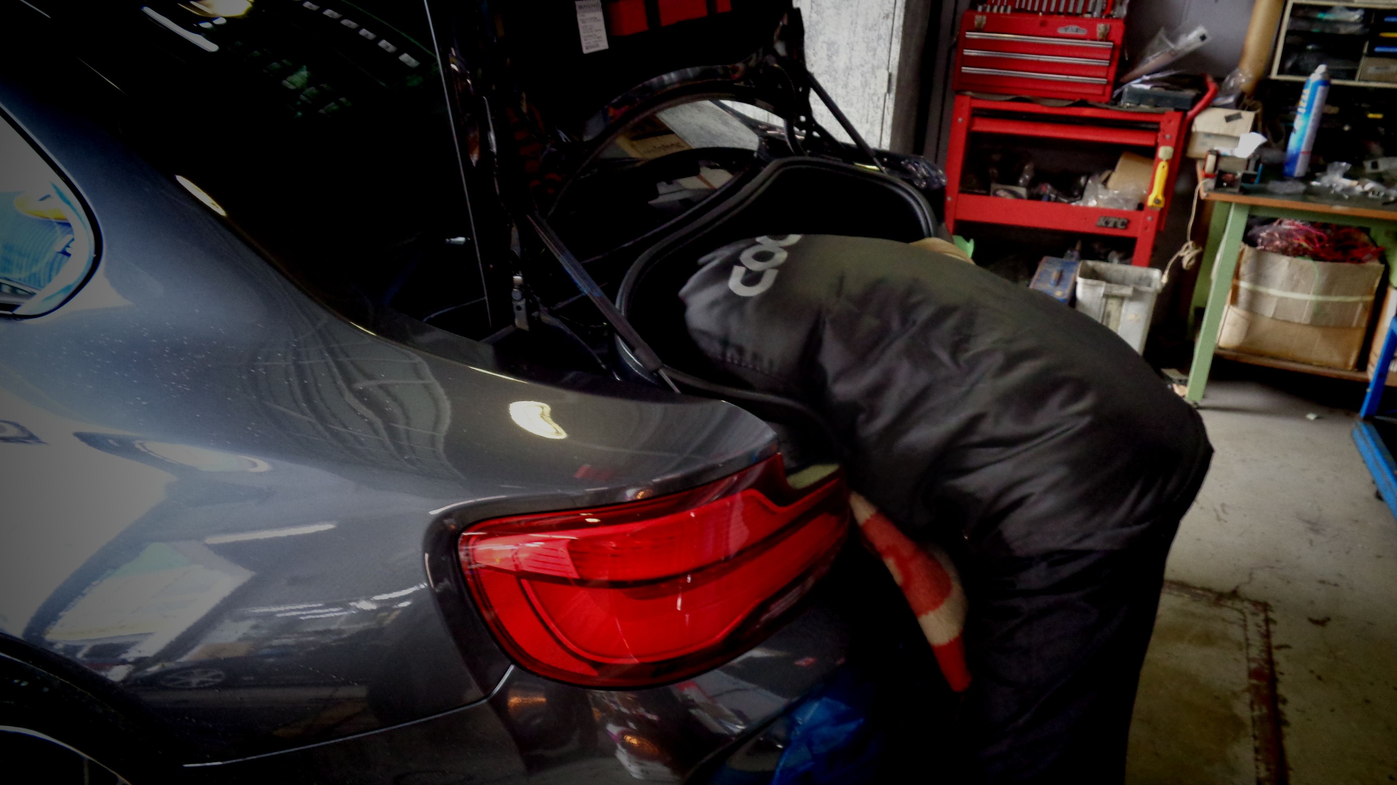 今回の”M2”もトランク側から作業開始。