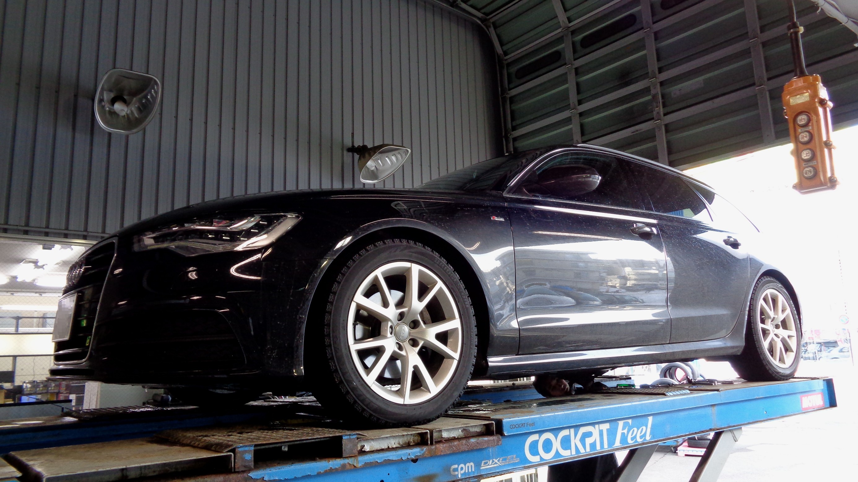 4輪アライメント用のリフトに車を載せて