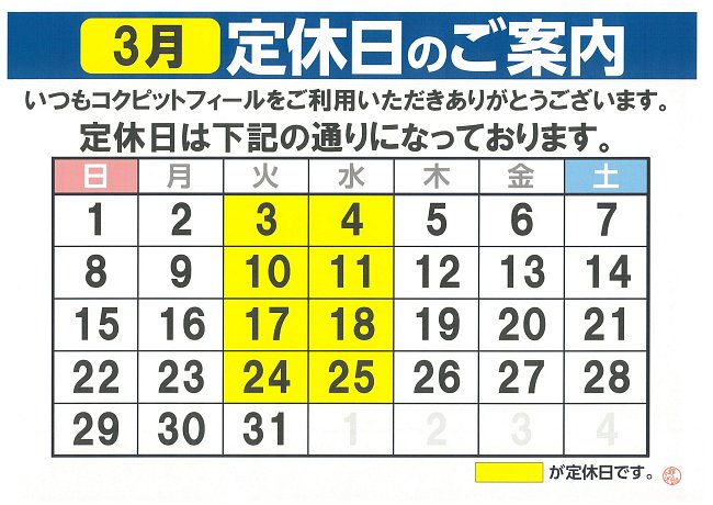 2026年3月 定休日のお知らせ。
