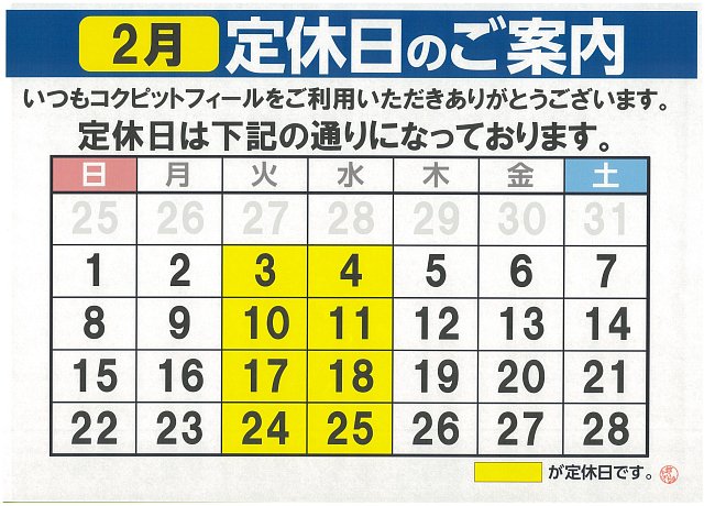 2026年2月 定休日のお知らせ。