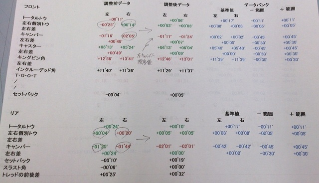 現状、トウの大きなズレとキャンバー値の左右差が気になるところでしたが、調整範囲の中で左右差はキレイに改善いたしました♪