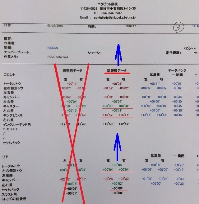 今回はお客様の乗り方と車輌の特性(馬力は400近い)と実際の足回りの調整幅を考慮して、試乗→調整→数値測定を数回繰り返し、お客様の納得のいく動きをするお車に仕上がりました。