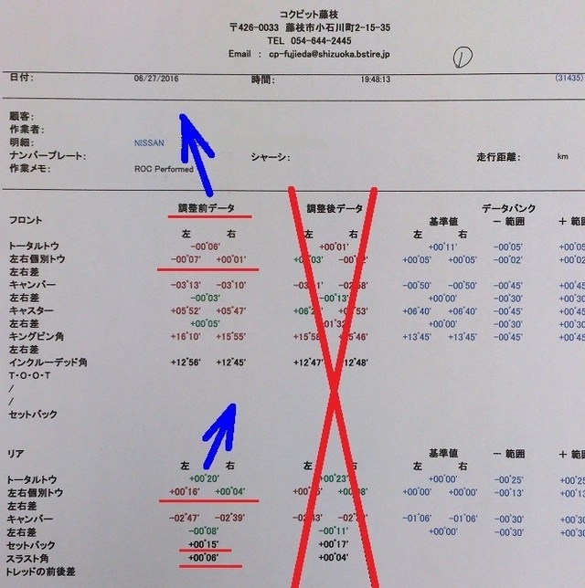 最後はお客様に走行フィーリングを伺い、サーキット走行後時のデータなどをもとにアライメントの数値を決めました。