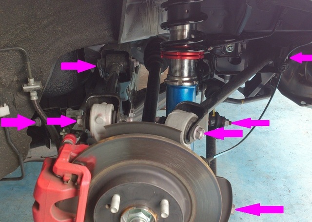 車高を下げた際はこれらの箇所を一度緩め、地面に接地した状態の角度で締め直してあげる事が必要なんです。