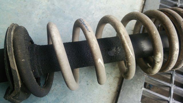 下の画像では、限界を超えてアブソーバーからオイル&ガスが吹き出てしまっていて、そこに汚れが付着し、真っ黒になっているのがお解りになると思います。