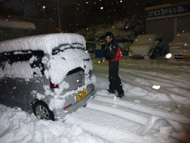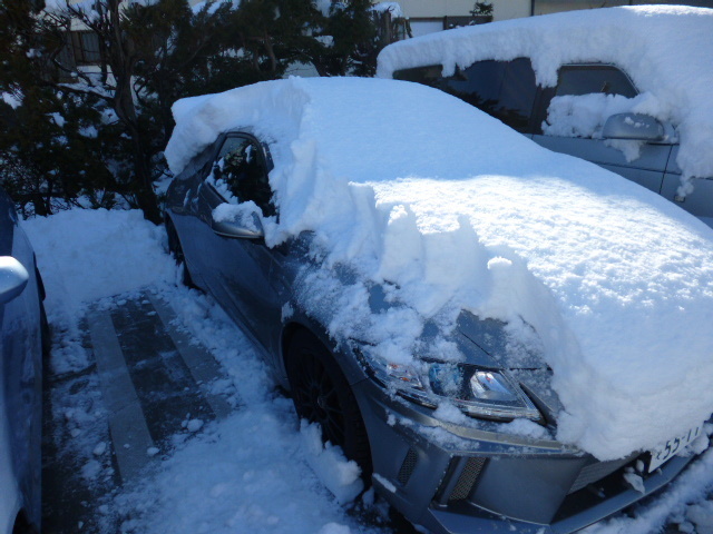 せっかく綺麗にしたのに、スタッフ戸田が車の屋根の雪を反対側から落としたので
