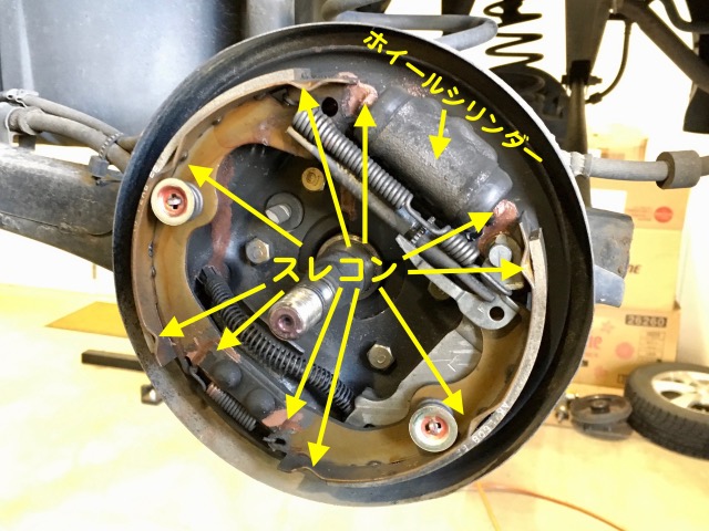フロントはキャリパーを、リアはドラムを開けてパッド・ライニング他各部点検・清掃・スレコンをさしていきます。普段は開けない部分ですのでしっかりと点検・作業します。