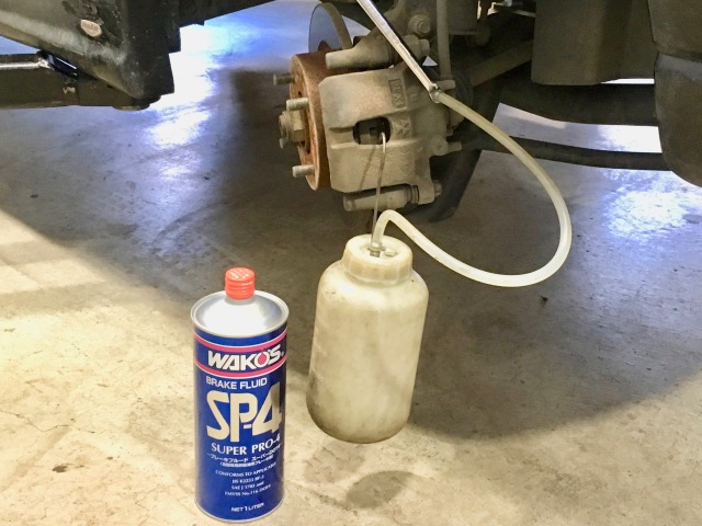 エンジンルームの整備が終わったらタイヤを付ける前にブレーキフルード交換です。1万キロごとがオススメですが最低2万キロ・2年毎・車検整備と一緒にやっておきましょう。