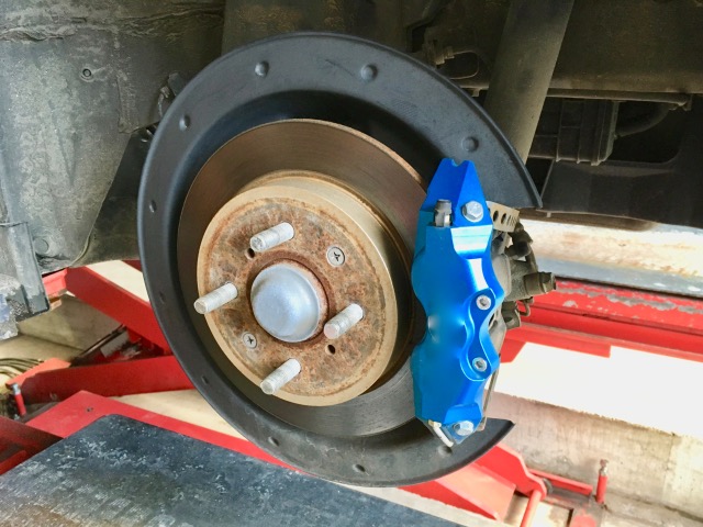 タイヤを外してる間にちょっと面白いパーツのご紹介。まずはリアブレーキですが、最近この手のキャリパーカバーを付けてる方結構多いです。種類も結構あります。こちらのインサイトのステキなところはリアのなんちゃってからフロントに目を移すと