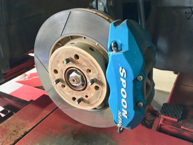 本物です(笑)SPOONモノコックキャリパーです。制動力向上はもちろんですがこのキャリパーすごく軽いです。バネ下重量軽減で元祖ハイブリッド車のインサイトに燃費向上やハンドリング性能向上といった恩恵を与えてくれます。見た目もカッコイイですしね。