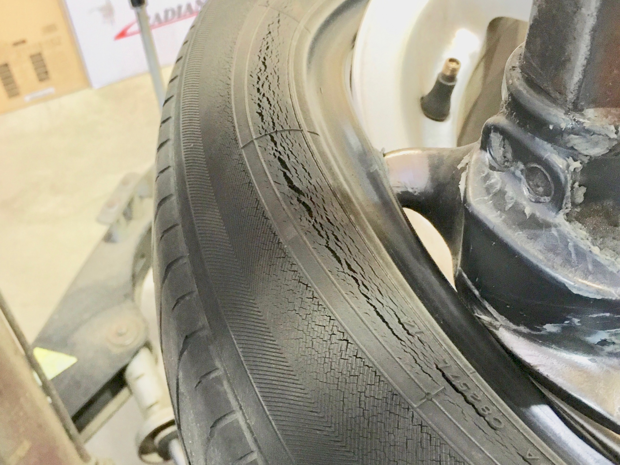 エアーが入っていると見落としがちですが、こうしてタイヤチェンジャーにセットてみるとよく分かるサイドウォールにこんなにもヒビ割れが!