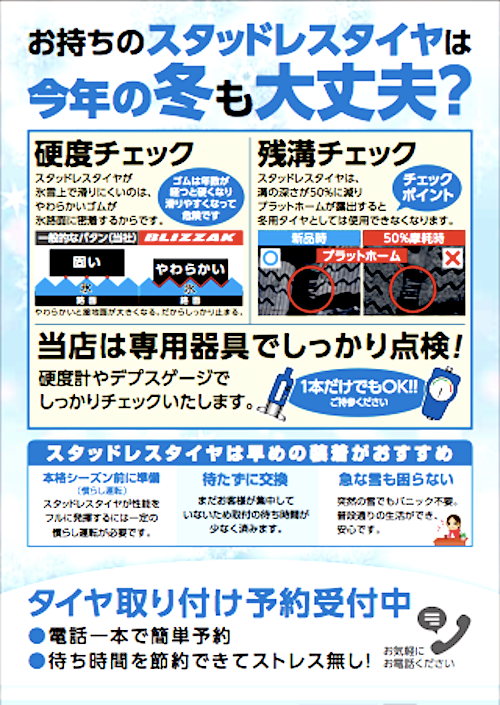 お手持ちのスタッドレスタイヤの点検ももちろん無料ですのでお声がけください。