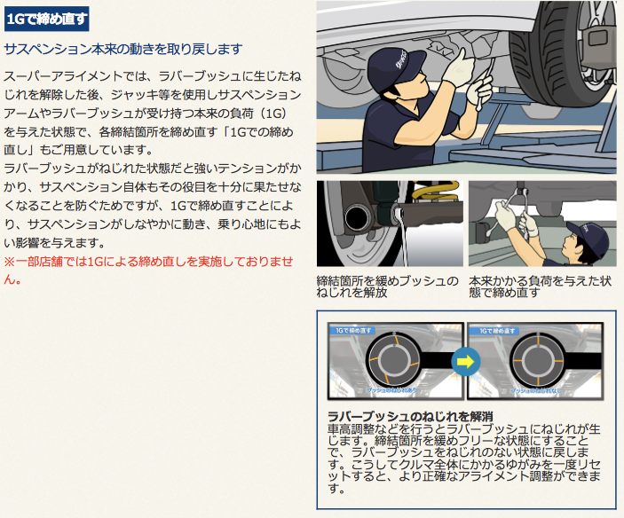 「新車なのに?」って思われた方。クルマの製造ラインでサスペンション関連部分を組み立てる時って宙ぶらりんですよね?で、組み立てが終わってからタイヤを付けて完成するわけですが、その時点でラバーブッシュなどにねじれが発生してます。さらに車高調で車高が変化すれば、さらにねじれが増しちゃいます。そこで一度各サスペンション連結ボルト類を緩めた上で仮想1Gの負荷をかけた状態で締め直し、ブッシュ類のねじれを解消してあげます。こうしてクルマ全体にかかる”ゆがみ”をリセットして、サスペンション本来の動きを取り戻した上で正確なアライメント調整をするのがスーパーアライメントです。*長文失礼しました(笑