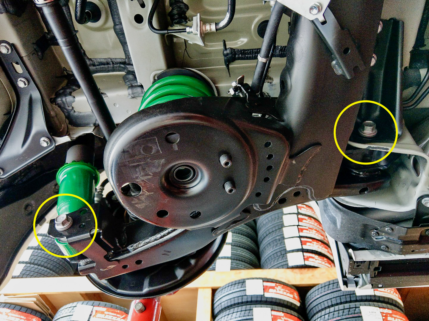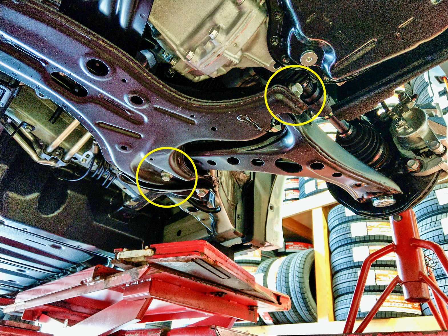 画像◯印とフロントストラットの取付部で合計12箇所を『1G締め直し』です。