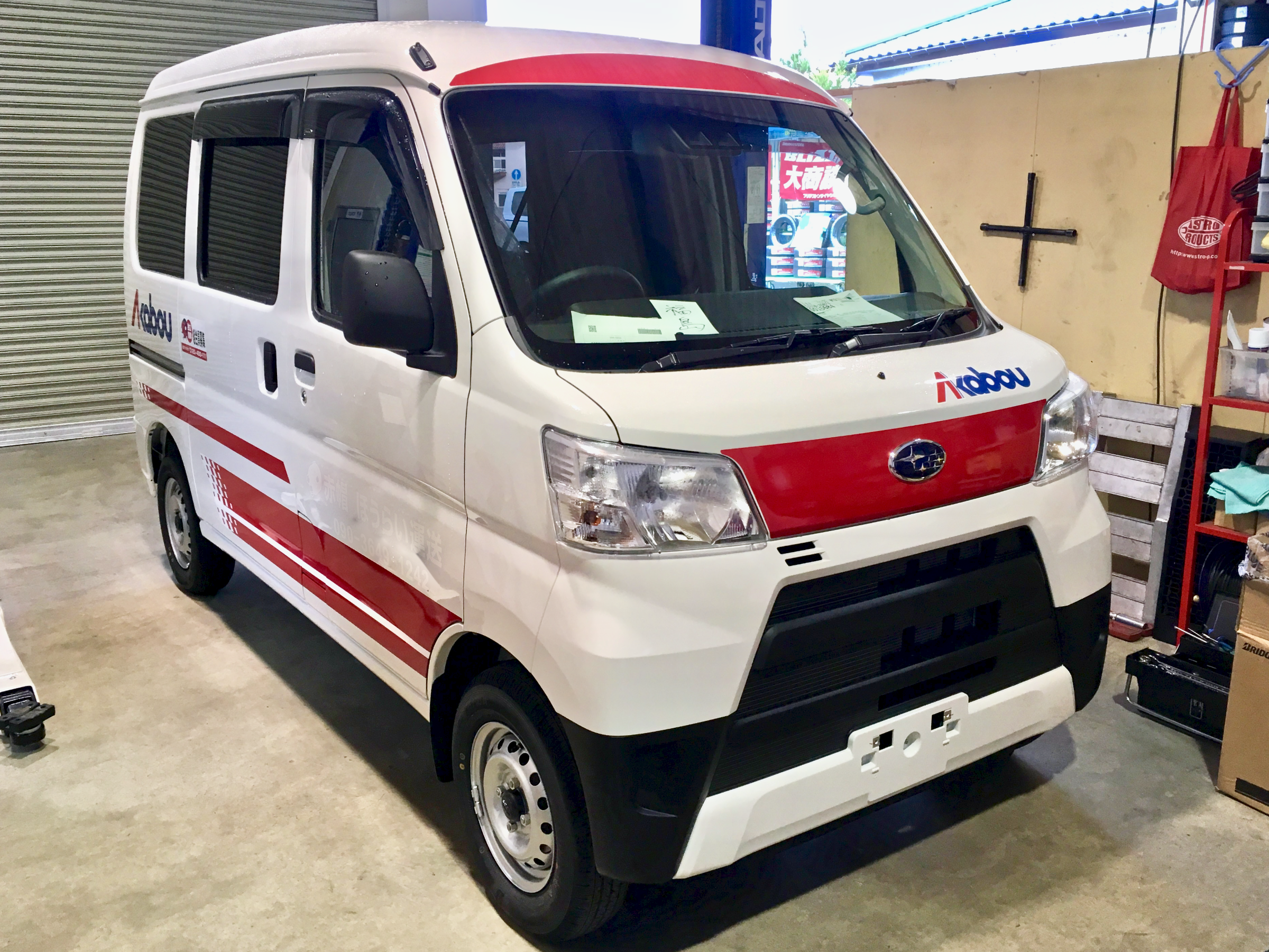 用品の取付で、帽、、、ぢゃなかった(汗、某運送屋さんの新しい新型サンバーが入庫してました(笑
